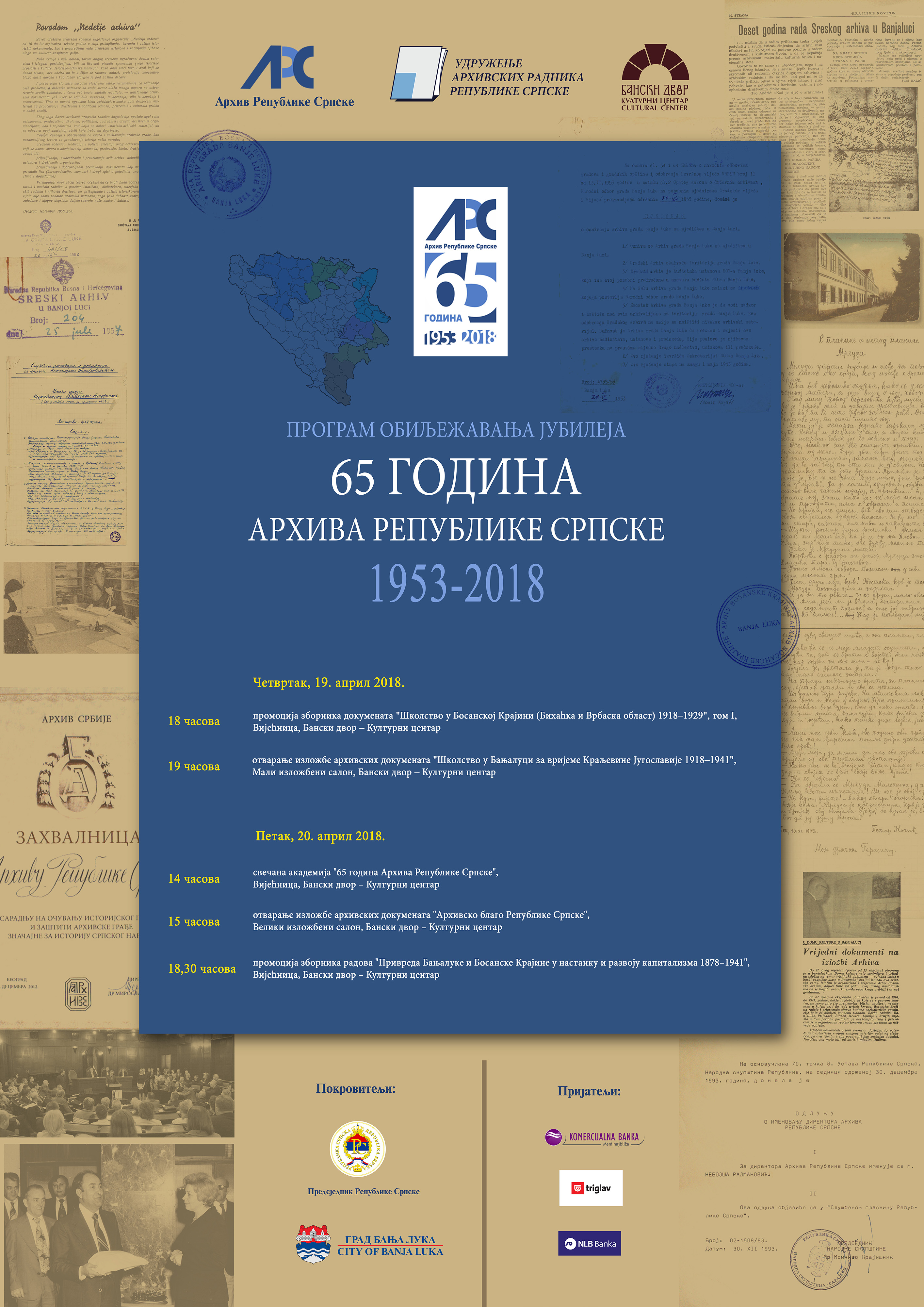 Архив Републике Српске, 19. и 20. априла ове године, обиљежава вриједан јубилеј – 65 година постојања и рада. Тим поводом, биће организовани свечана академија, изложбе и промоције.