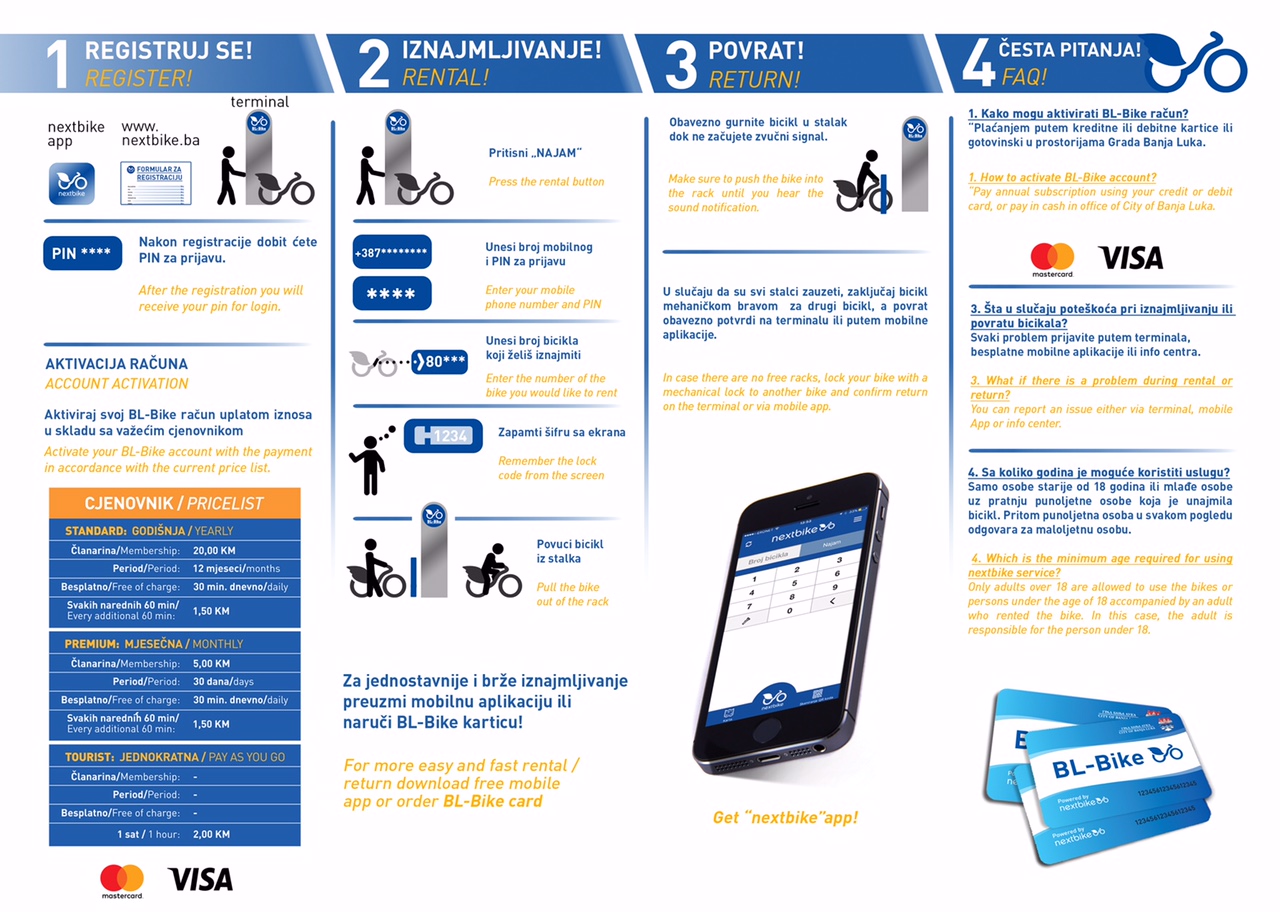 Zainteresovani za korištenje ovog sistema mogu se registrovati putem interneta (www.nextbike.ba/sr/banjaluka/), a link se nalazi i na našoj stranici, u rubrici „Naše natraženije usluge“), zatim mobilnom aplikacijom, te direktno na terminalu ili dolaskom u prostorije Odjeljenja za saobraćaj i puteve. Dolaskom na terminal i provjerom identifikacije, sistem automatski otključava bicikl. Po završetku vožnje, korisnik vraća bicikl na jedan od terminala, a sistem automatski vrši obradu i naplatu u zavisnosti od vremena korištenja bicikla. Kompletno uputstvo možete vidjeti na ilustraciji u ovom tekstu.