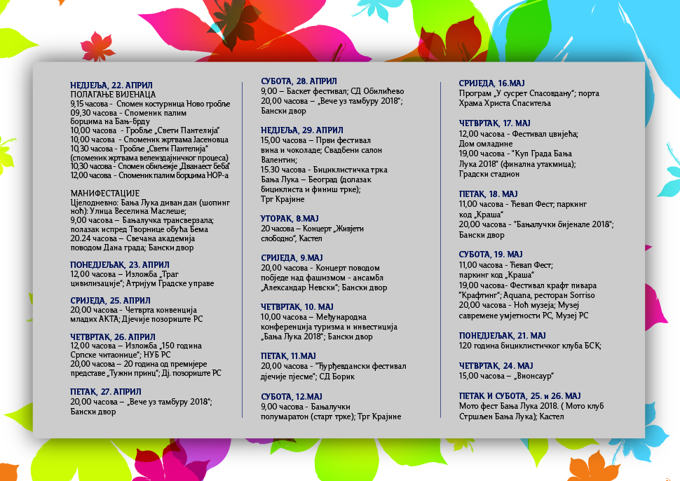 Banja Luka danas obilježava Dan grada i 73 godine od oslobođenja od fašizma u Drugom svjetskom ratu. Tim povodom, planirane su brojne manifestacije, a tokom dana na nekoliko lokacija biće položeni vijenci.