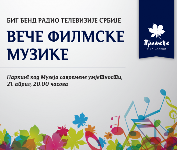 Koncert Big bend orkestra Radio televizije Srbije, pod nazivom „Veče filmske muzike“, biće održan večeras, 21. aprila, sa početkom u 20.00 časova na parkingu kod Muzeja savremene umjetnosti.