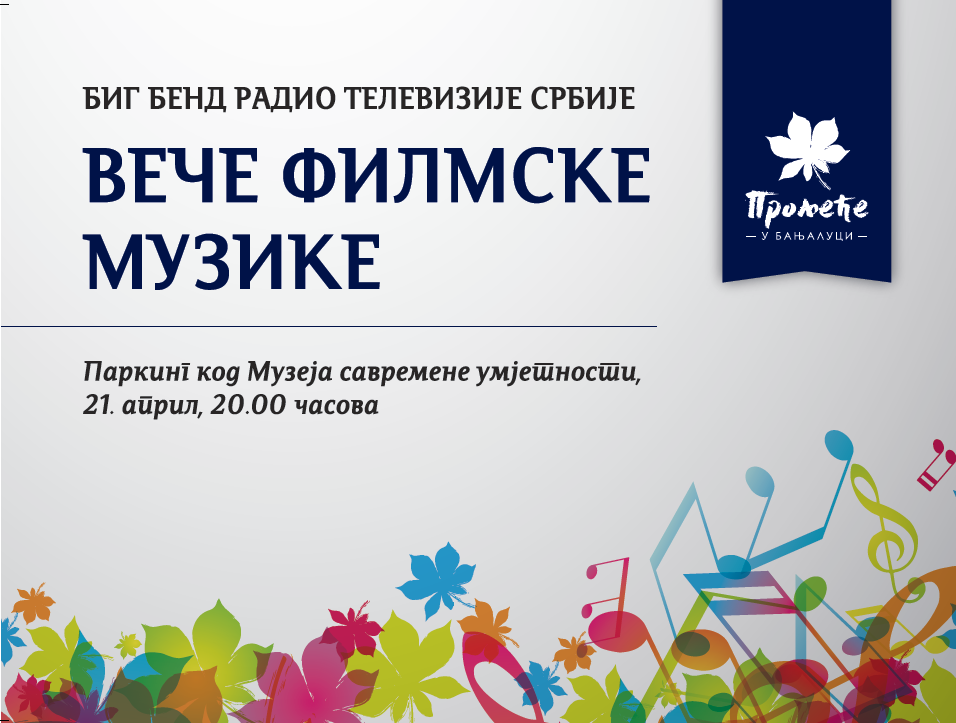 Koncert Big bend orkestra Radio televizije Srbije, pod nazivom „Veče filmske muzike“, biće održan večeras, 21. aprila, sa početkom u 20.00 časova na parkingu kod Muzeja savremene umjetnosti.