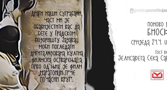 U okviru manifestacije “Proljeće u Banjaluci”, gradsko pozorište “Jazavac” organizuje reviju kultnih filmova domaće kinematografije koji su proglašeni za kulturno dobro. Biće prikazano devet filmova koji su digitalno restaurirani, a revija će biti otvorena u srijedu 24. aprila u 20.00 časova, projekcijom filma “Maratonci trče počasni krug”. Specijalni gost na ovoj projekciji biće jedna od glumica koja je igrala u ovom filmu i jedna od najvećih jugoslovneskih glumica svih vremena – Jelisaveta Seka Sablić. Nakon projekcije filma biće upriličen i razgovor sa ovom velikom glumicom, koji će voditi Slađana Zrnić.
