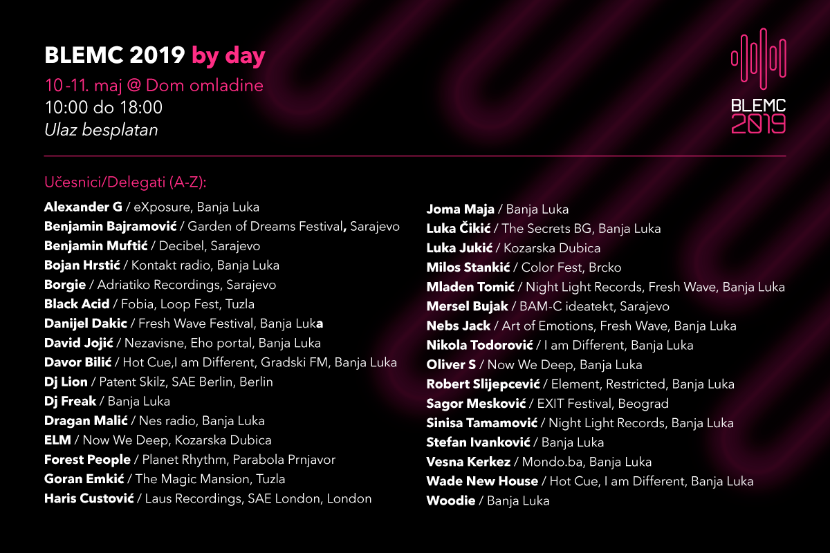 У оквиру манифестације „Прољеће у Бањалуци“, 10. и 11. маја у бањалучком Дому омладине биће одржана прва Конференција електронске музике BLEMC 2019.