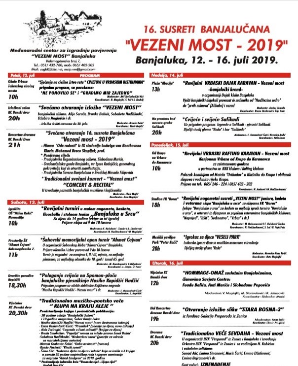 Шеснаести сусрети Бањалучана „Везени мост – 2019“ биће одржани од 12. до 16. јула, најавио је организатор – Међународни центар за изградњу повјерења „Везени мост„ Бања Лука.