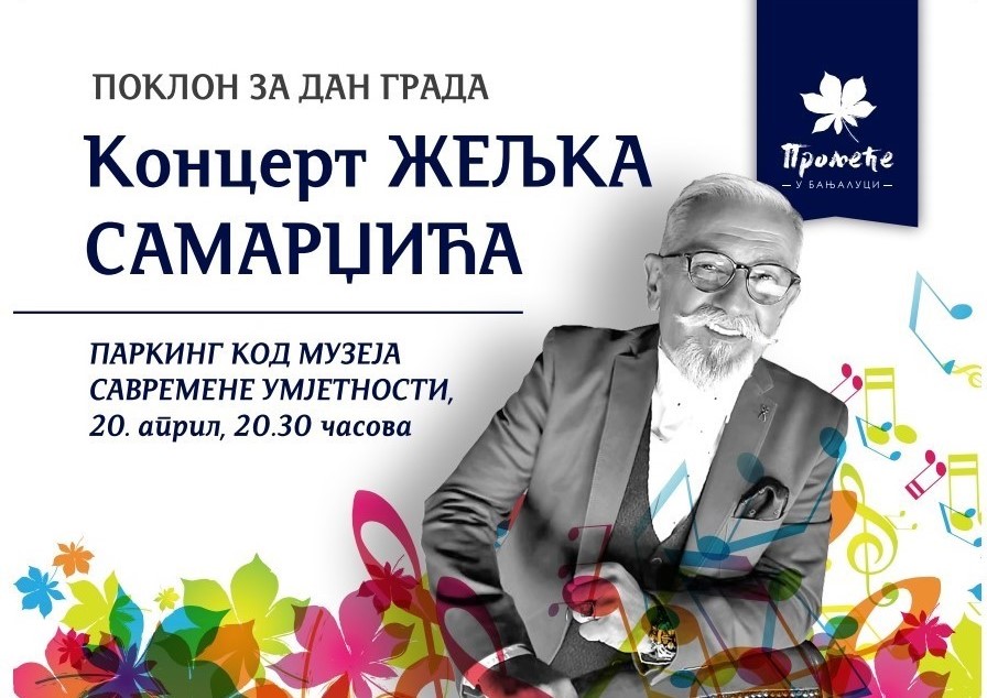 Велика регионална музичка звијезда Жељко Самарџић, наступиће у Бањој Луци 20. априла, поводом Дана града. Улаз је бесплатан за све наше суграђане, а концерт ће бити одржан на простору паркинга код Музеја савремене умјетности РС, са почетком у 20.30 часова.