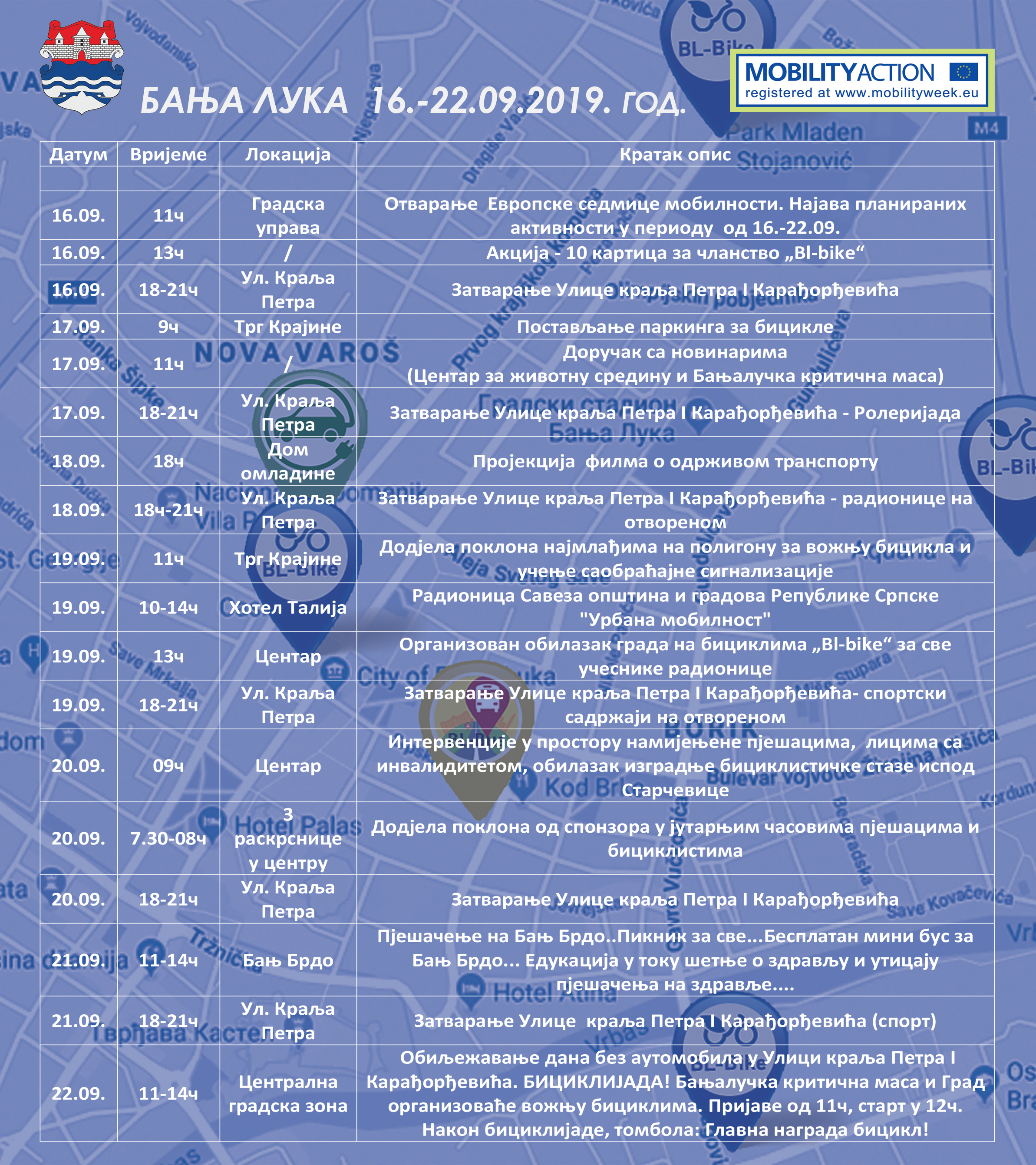 „Европска седмица мобилности“ завршава се 22.септембра, обиљежавањем „Дана без аутомобила“. За тај дан, планирано је више догађаја у централној градској зони, која ће бити затворена за саобраћај цијели дан. Један од догађаја јесте бициклијада, за коју регистрација почиње у 11 часова на паркингу код Музеја савремене умјетности РС, а старт је у 12 часова. Након бициклијаде, биће одржана томбола са пригодним поклонима. Град ће, тог дана, и свим регистрованим члановима „Бајк шеринг“ система обезбједити од 11 до 14 часова бесплатно кориштење бицикла.