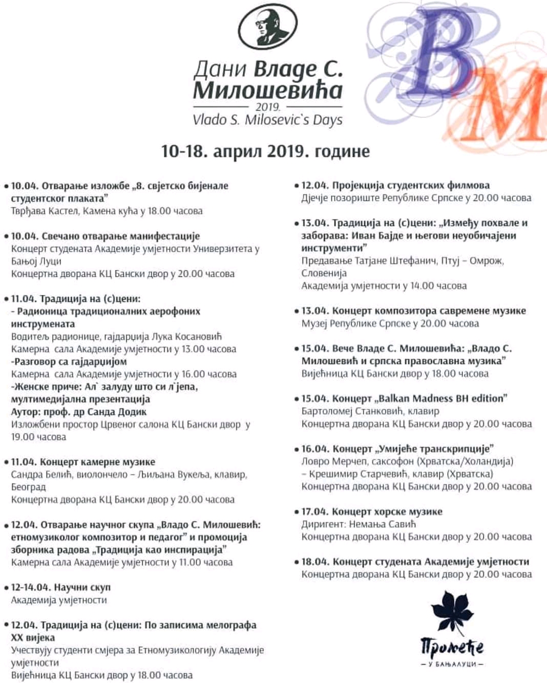 Традиционална манифестација “Дани Владе С. Милошевића”, посвећена великом композитору и етномузикологу, биће одржана од 10. до 18. априла у Бањој Луци.