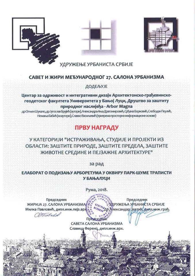 -Предвиђено је да овај простор, осим научној и образовној функцији арборетума, буде посвећен и другим облицима јавне употребе: активној рекреацији, излетничким активностима, прикладним (мањим) облицима угоститељства, јавним догађањима и слично – казао је доцент др Огњен Шукало са Архитектонско-грађевинско-геодетског факултета Универзитета у Бањој Луци, који је, заједно са доцентом др Југославом Брујићем из удружења Arbor magna и другим члановима тима, урадио елаборат о подизању арборетума у оквиру парк-шуме у Трапистима. За овај рад, тим је, недавно, добио прву награду 27. салона урбанизма Удружења урбаниста Србије, у категорији „Истраживања, студије и пројекти из области: заштите природе, заштите предјела, заштите животне средине и пејзажне архитектуре“.
