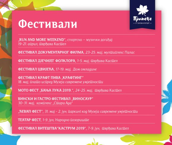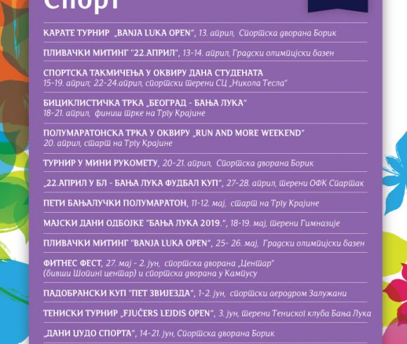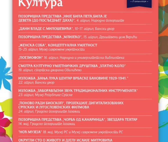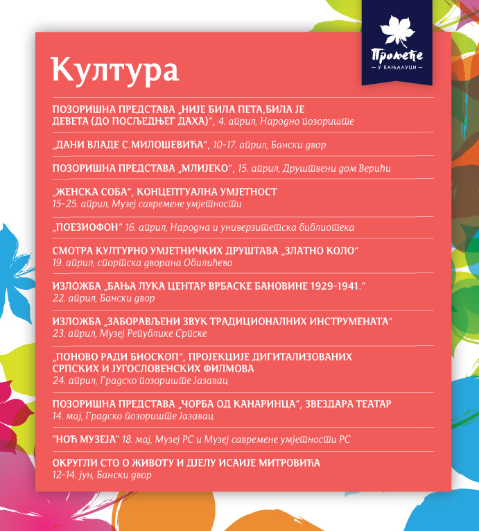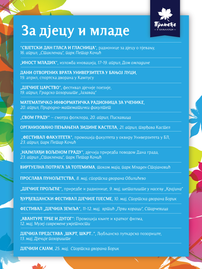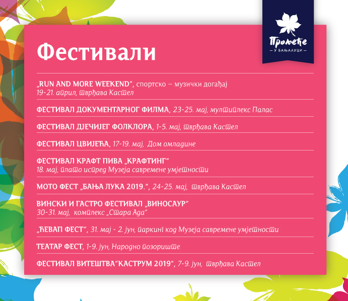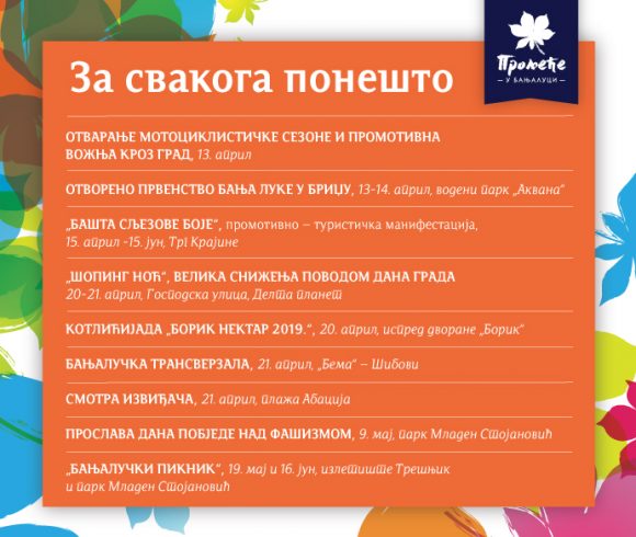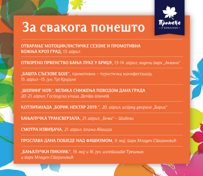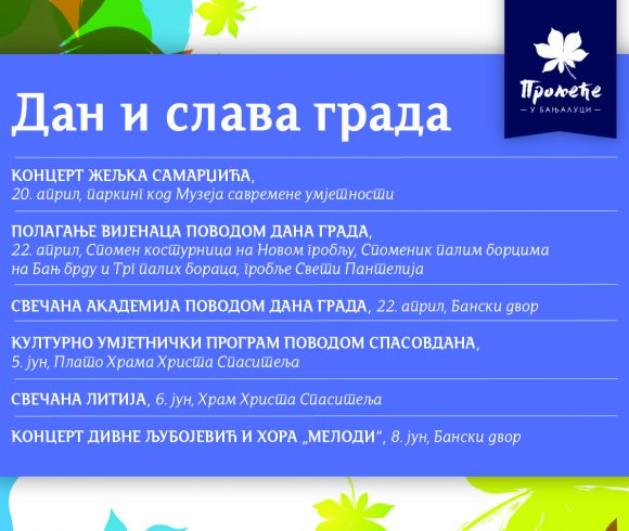 У наставку, на слајдовима, погледајте распоред свих догађаја у оквиру „Прољећа у Бањалуци“.