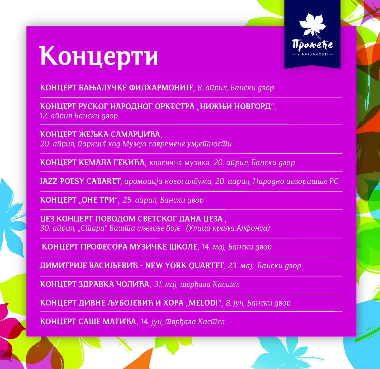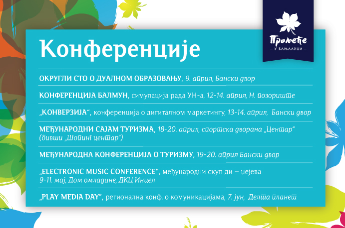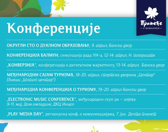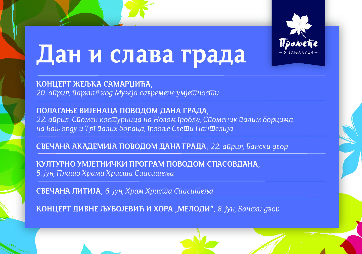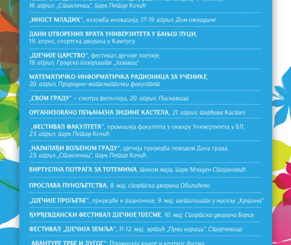 У наставку, на слајдовима, погледајте распоред свих догађаја у оквиру „Прољећа у Бањалуци“.
