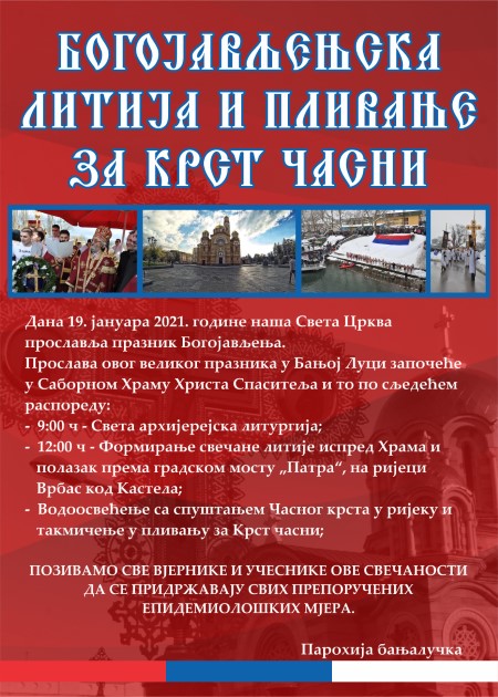 Povodom velikog hrišćanskog praznika Bogojavljenja, u Banjoj Luci će sutra, 19. januara, biti održana Bogojavljenska litija i plivanje za Časni krst.