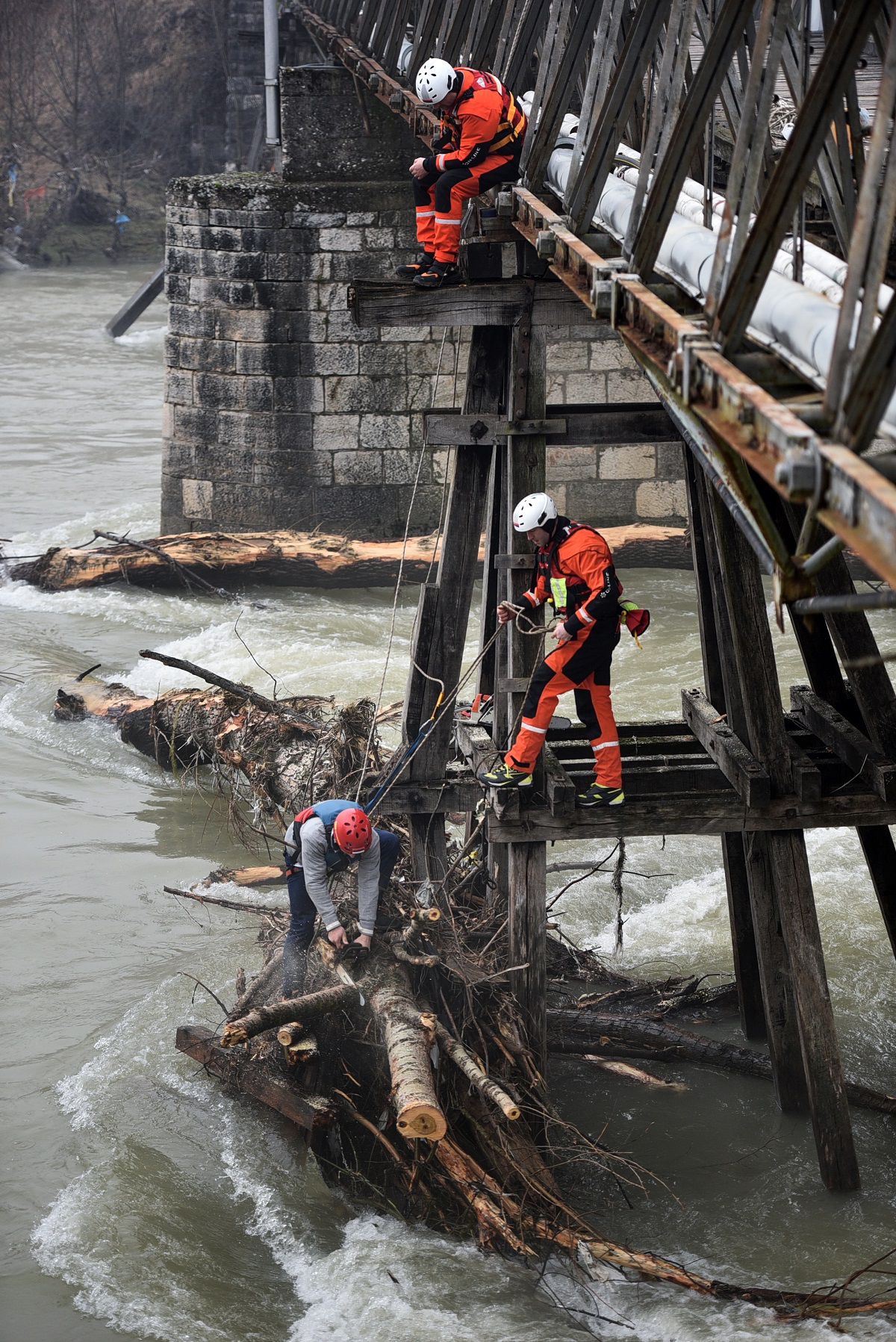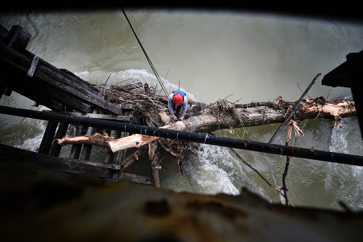 Једно такво, наплављено велико стабло зауставило се на конструкцији старог моста у Трапистима, пријетећи да угрози његову стабилност.