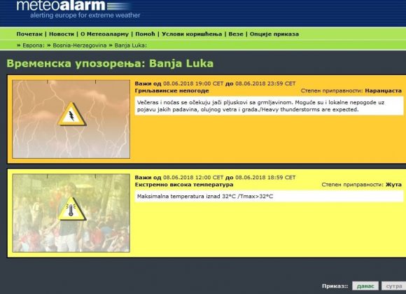 Informacije o potencijalno opasnim vremenskim prilikama i njihovim promjenama mogu se prati i na ovom linku.