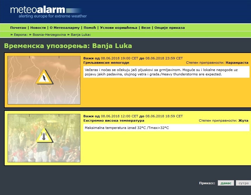 Informacije o potencijalno opasnim vremenskim prilikama i njihovim promjenama mogu se prati i na ovom linku.