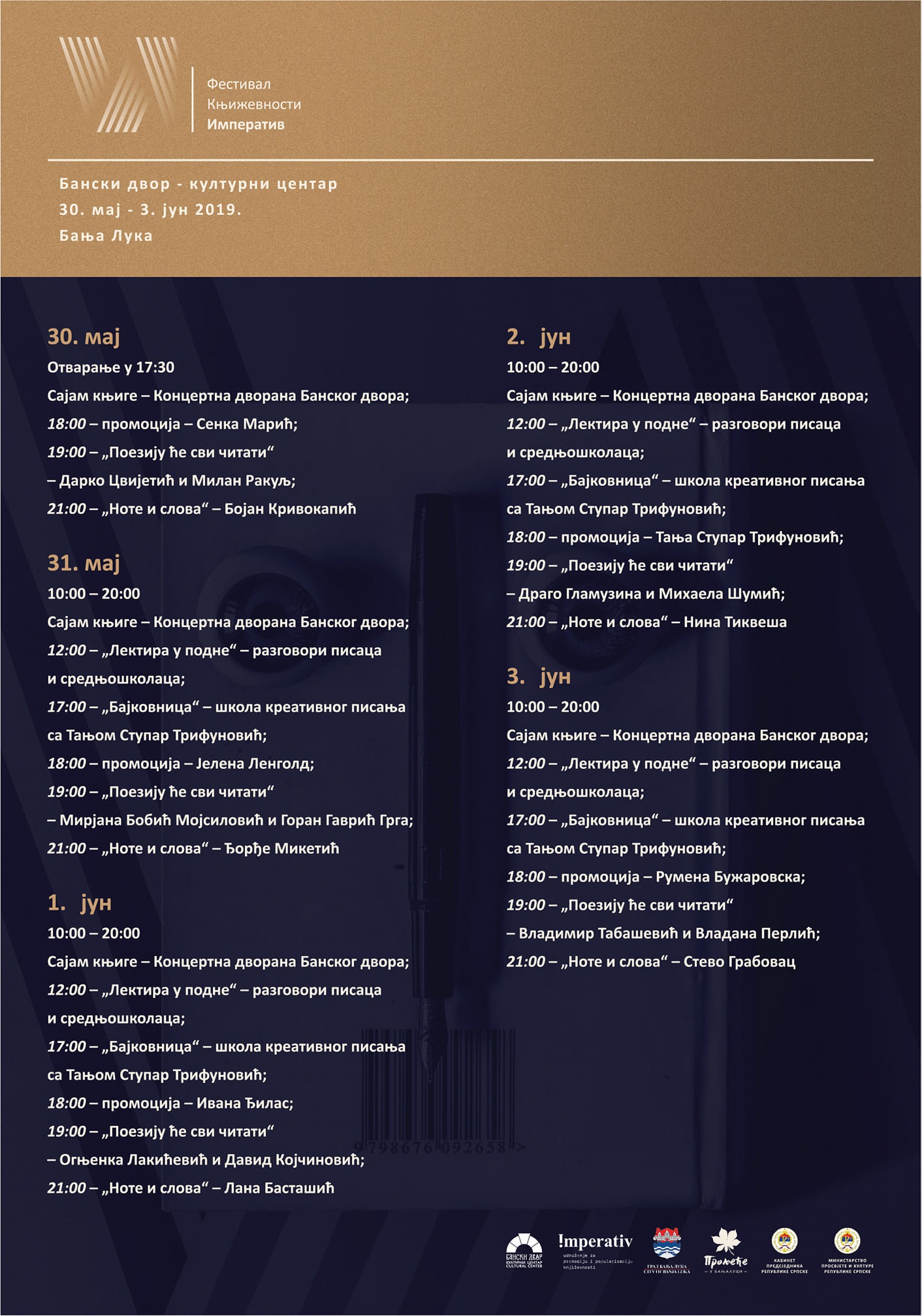 “Све је спремно за отварање другог Фестивала књижевности ‘Императив’. Трудили смо се да за наше посјетиоце припремимо богат програмски садржај. Током пет фестивалских дана на Арт тераси и у Црвеном салону Банског двора – Културног центра посјетиоци ће имати прилику да се друже и упознају са познатим и признатим писцима из региона, али и са оним млађим ауторима чија ће имена, сигурни смо, постати важна на књижевној сцени. У концертној дворани биће отворен сајамски дио фестивала, гдје ће 13 одабраних издавача представити своја издања по повољним сајамским цијенама. Улаз на све промоције и догађаје у оквиру Фестивала је слободан”, саопштили су организатори.