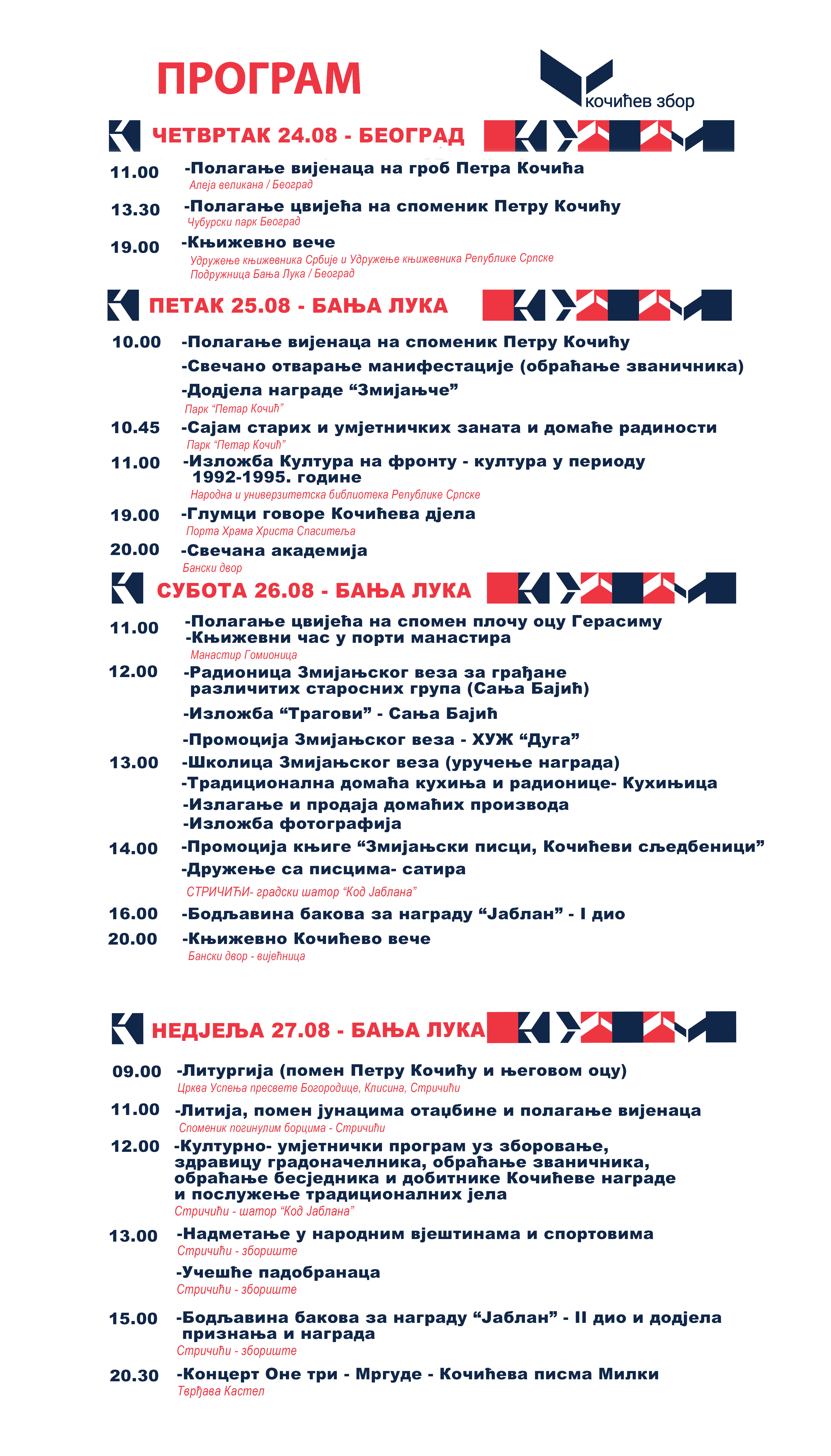 • subota, 26. avgust – polazak iz Banje Luke sa Stare autobuske stanice u 11.00 časova, a povratak iz Stričića u 18.00 časova;