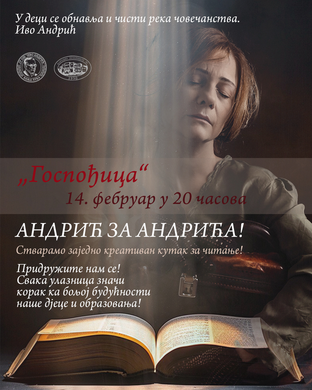-Дио прихода од наше вишеструко награђиване представе „Госпођица“, која је рађена по истоименом роману Иве Андрића, биће усмјерен на овај заједнички пројекат. На тај начин, Андрић помаже Андрићу. Ова иницијатива долази као природни наставак вриједности којима нас Андрићеви романи уче – љубави према знању, култури и умјетности – наведено је у саопштењу Народног позоришта.