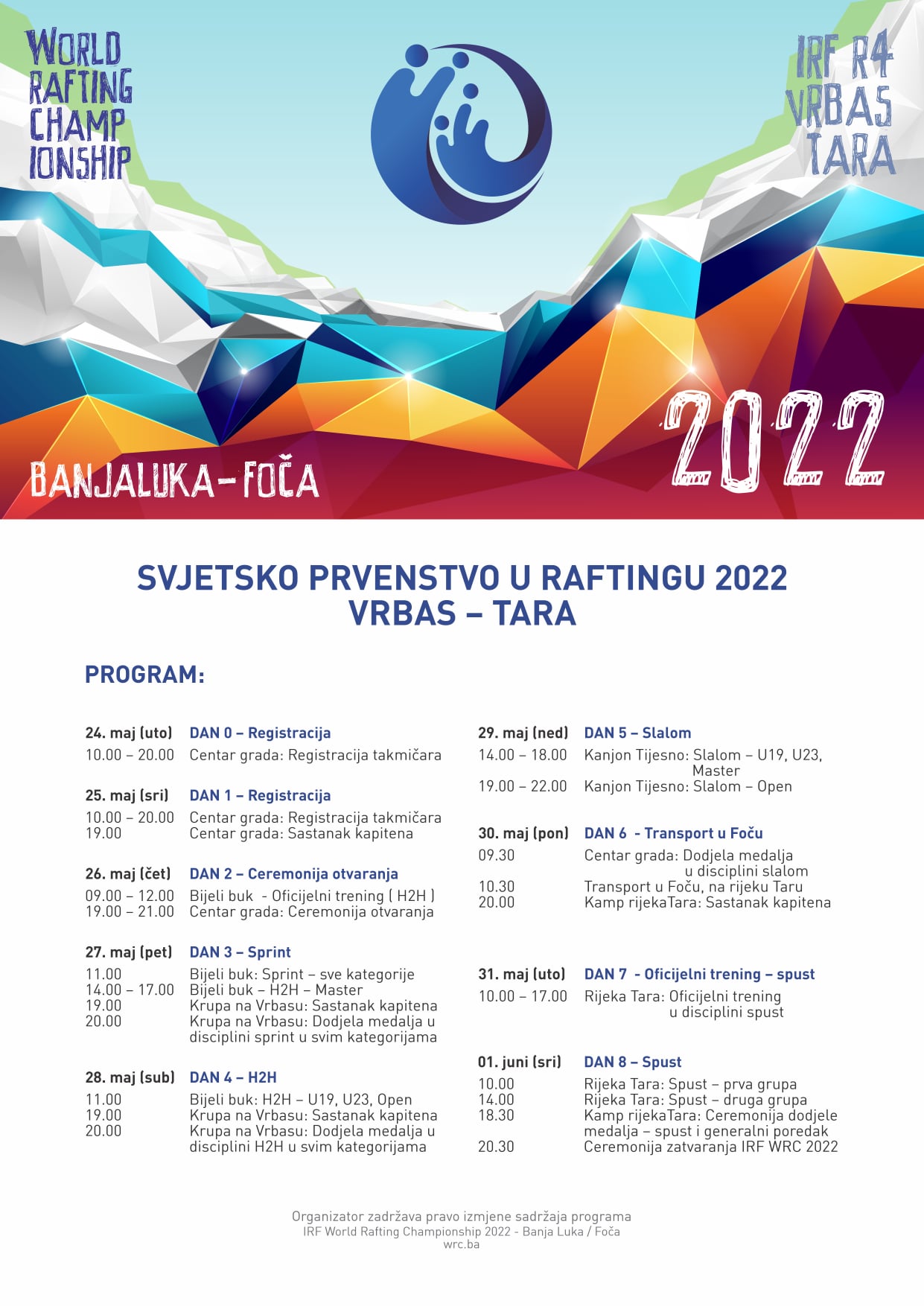 Организатор овог престижног такмичења је Рафтинг клуб „Кањон“, а комплетан распоред Свјетског првенства можете да погледате ОВДЈЕ.