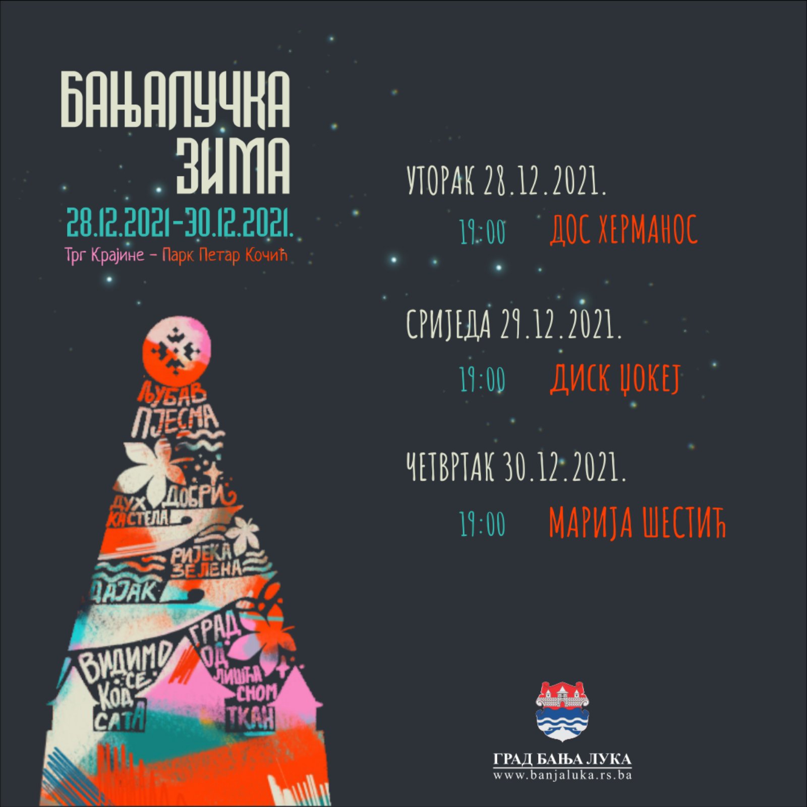 Осим сјајних музичких садржаја у Парку, суграђани и сви посјетиоци могу да уживају у зимској чаролији у центру града уз мноштво лампица, новогодишње јелке, прекрасне декорације, посебно уређену кућицу Дједа Мраза у Парку „Петар Кочић“, клизалиште, луна-парк и сјајну гастро понуду.