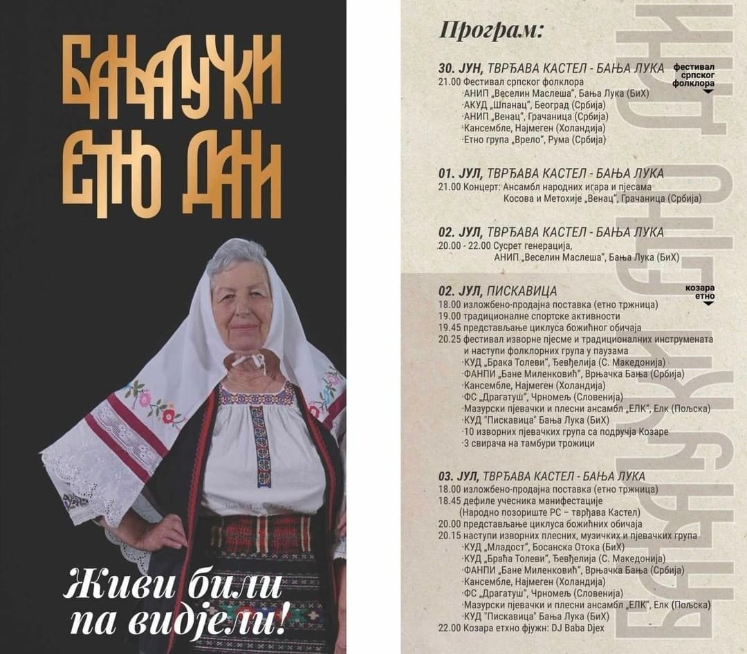 „Бањалучки етно дани“ почињу Фестивалом српског фолклора који ће бити одржан од 30. јуна до 2. јула на тврђави Кастел, а настављају са фестивалом „Козара етно“ који ће бити одржан 2. јула у Пискавици и 3. јула на тврђави Кастел.