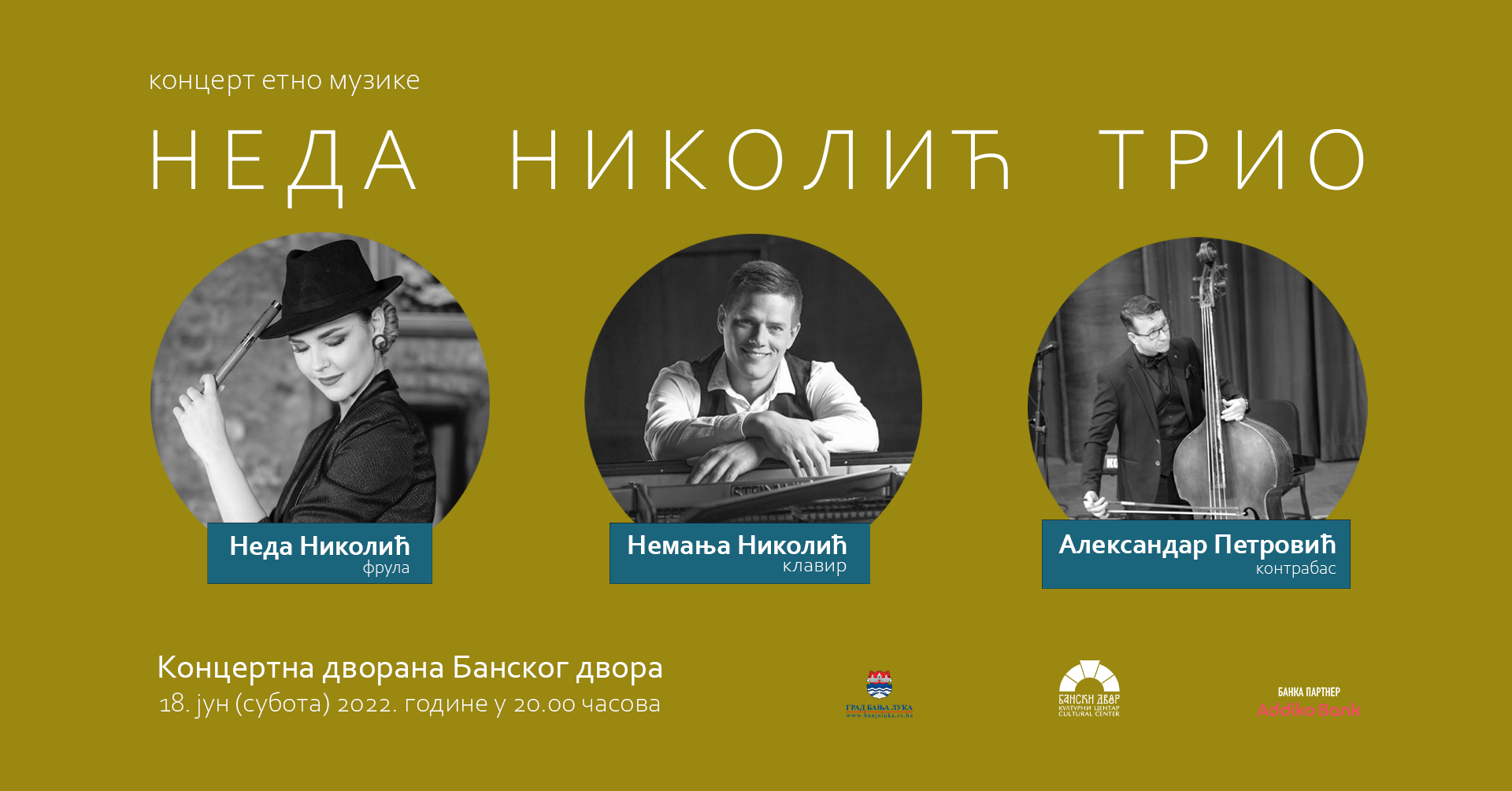 Koncert etno muzike Neda Nikolić Trio (Neda Nikolić – frula, Nemanja Nikolić, klavir i Aleksandar Petrović, kontrabas) biće održan u subotu, 18. juna od 20.00 časova u Koncertnoj dvorani Banskog dvora.