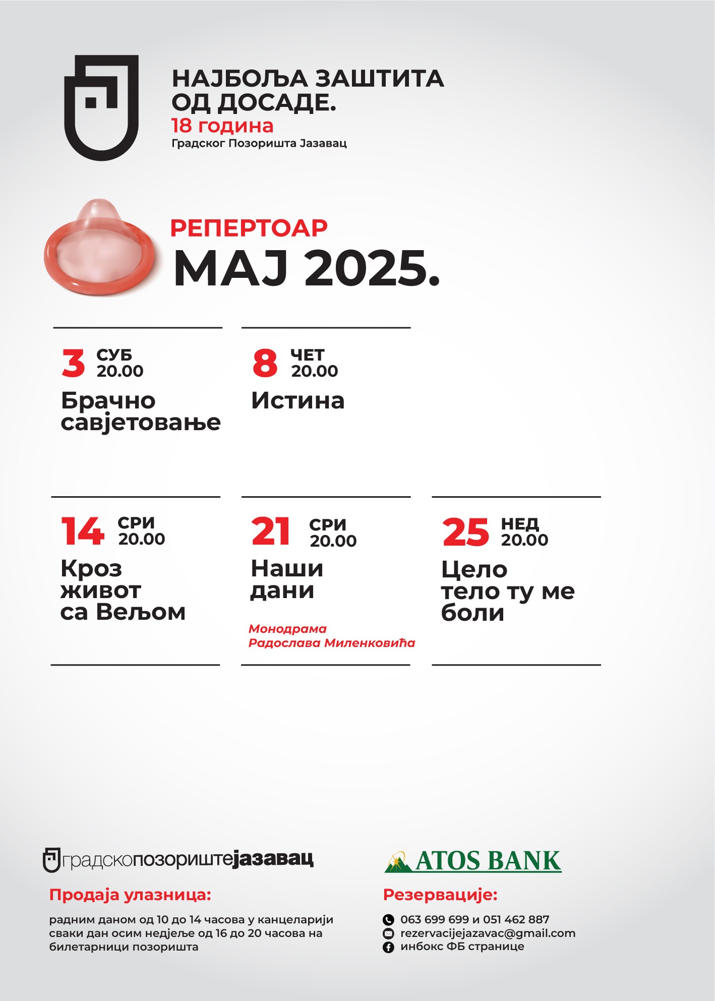Тако је 14. мај резервисан за представу „Кроз живот са Вељом“, а на репертоару се још налазе и представе „Истина“, „Наши дани“, те „Цело тело ту ме боли“.