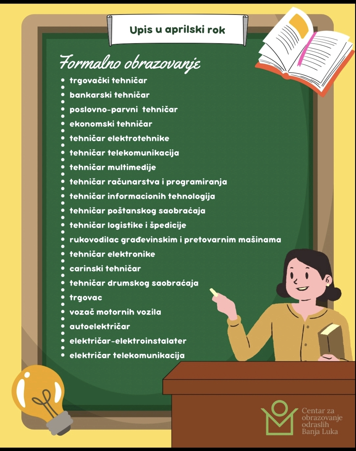 -Априлски уписни рок је почео за уписе у тражена занимања на тржишту рада. Ми смо установа са традицијом образовања одраслих већ 63 године. Пријаве су у току а конкурс је отворен до 22. априла до 15.00 часова – наводе из овог Центра.