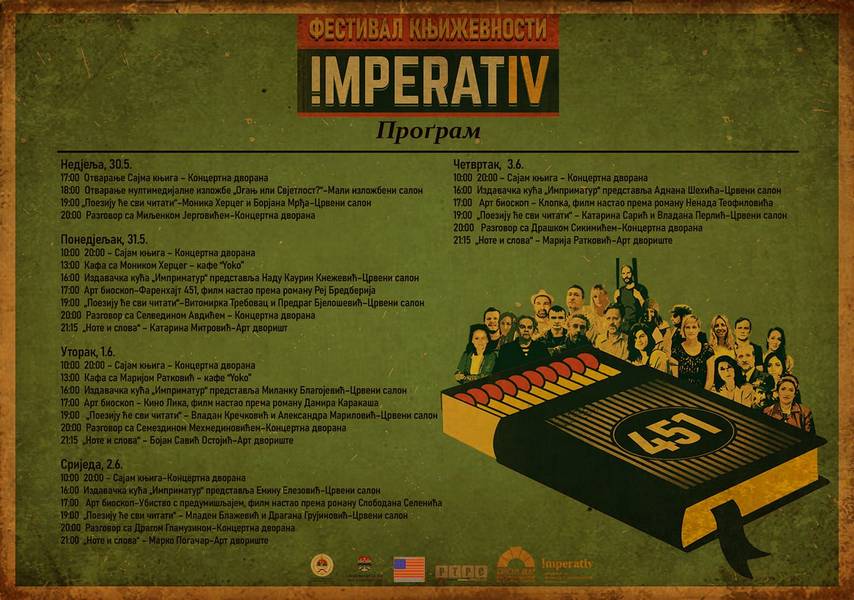 Град Бања Лука традиционално подржава ову манифестацију, организовану од стране Удружења за промоцију и популаризацију књижевности “Императив”, које ће током ових пет дана у нашем граду окупити више од 30 значајних домаћих и регионалних писаца попут Миљенка Јерговића, Семездина Мехмединовића, Драшка Сикимића, Селведина Авдића, Драгане Грујиновић, Владане Перлић, Предрага Бјелошевића и многих других.