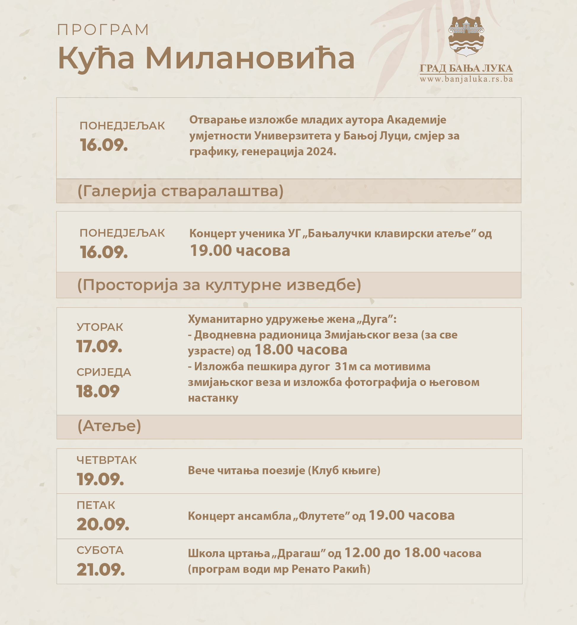 У петак ће бити одржан концерт ансамбла „Флутете“ и у суботу Школа цртања „Драгаш“, а комплетан програм за ову седмицу погледајте ОВДЈЕ.