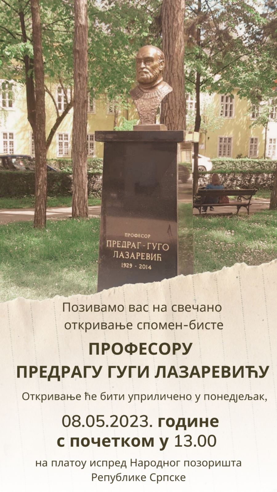 На платоу испред Народног позоришта Републике Српске, данас у 13.00 часова ће бити откривена спомен – биста професору Предрагу Гуги Лазаревићу.