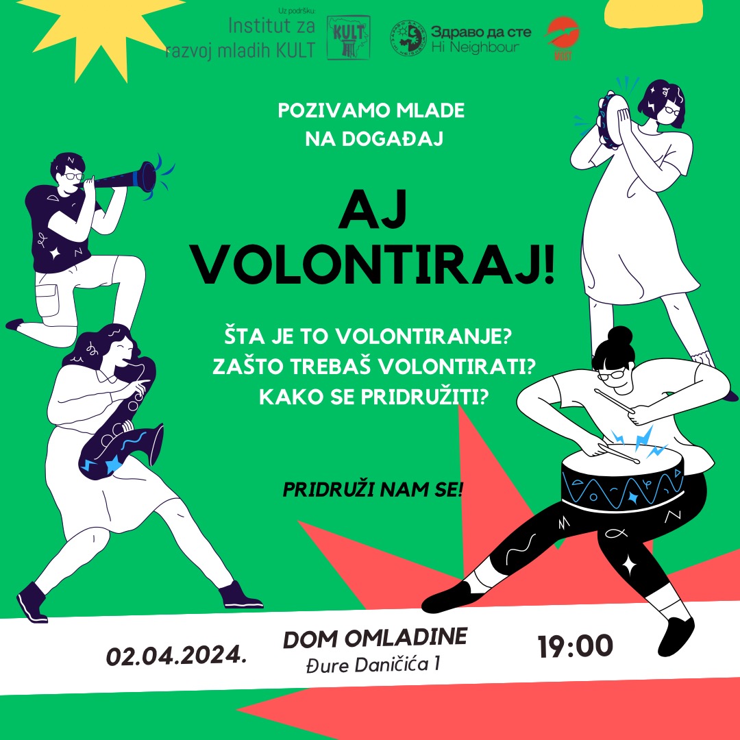 У Дому омладине 2. априла у 19.00 часова биће организован догађај о промоцији волонтирања, а сви заинтересовани имаће прилику да сазнају нешто више о овој теми.