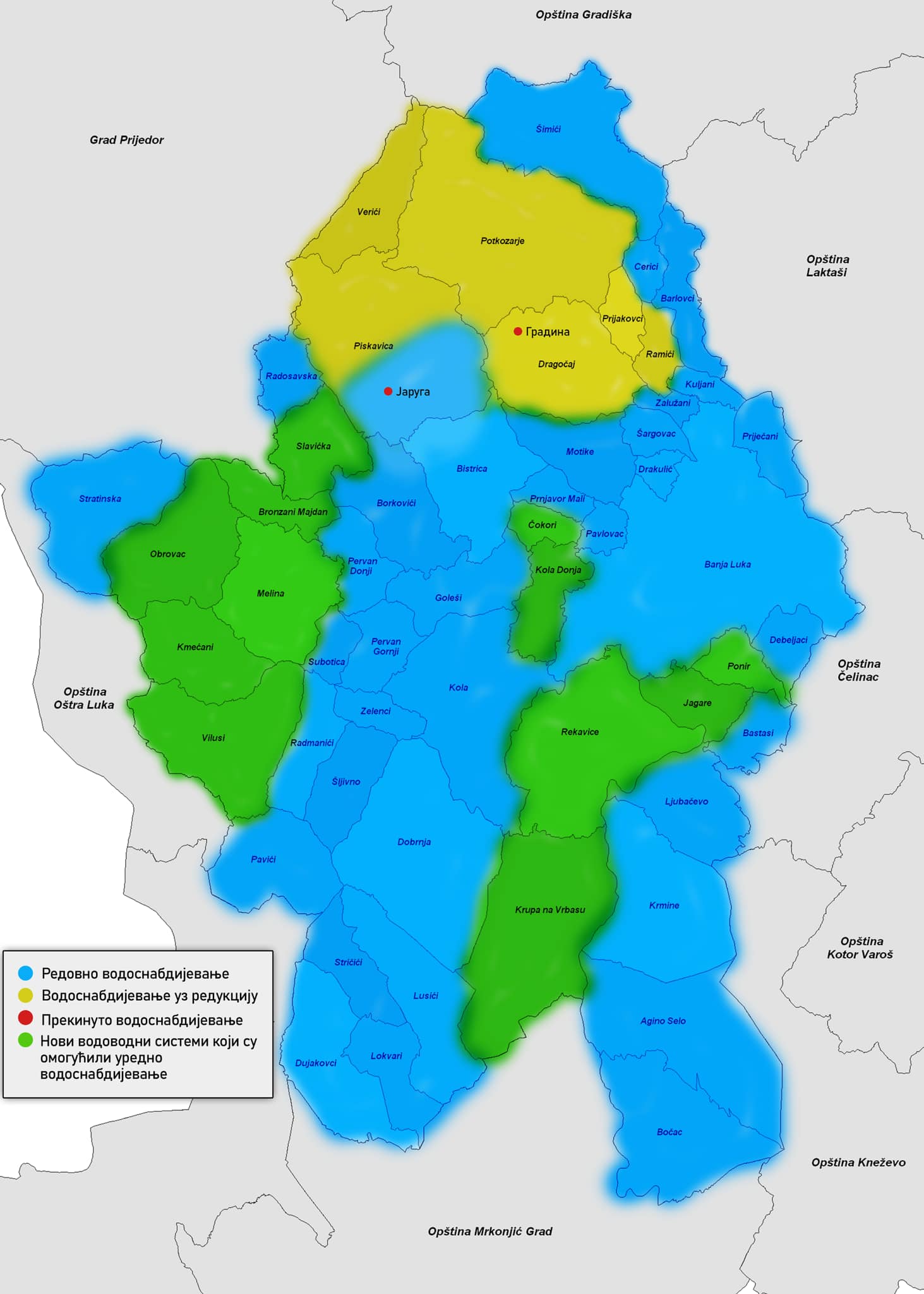 -На мапи су плавом бојом означена подручја у којима је водоснабдијевање редовно, зеленом бојом су све мјесне заједнице у којима смо изградњом водоводне мреже и резервоара обезбиједили редовно водоснабдијевање, што није био случај ранијих година, а у времену пред нама ријешићемо преостала жаришта и самим тим учинити да до ових проблема које имамо данас, више не долази – објаснио је градоначелник.