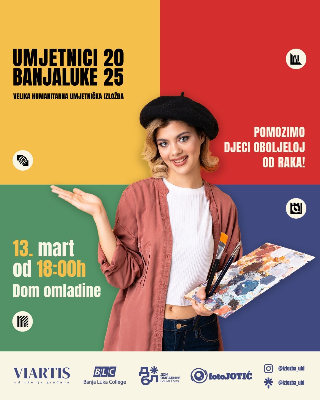 Удружење грађана „Виартис“ организује трећу по реду хуманитарну умјетничку изложбу „Умјетници Бањалуке 2025“, која ће бити одржана од 13. до 15. марта у Дому омладине са почетком од 18:00 часова.