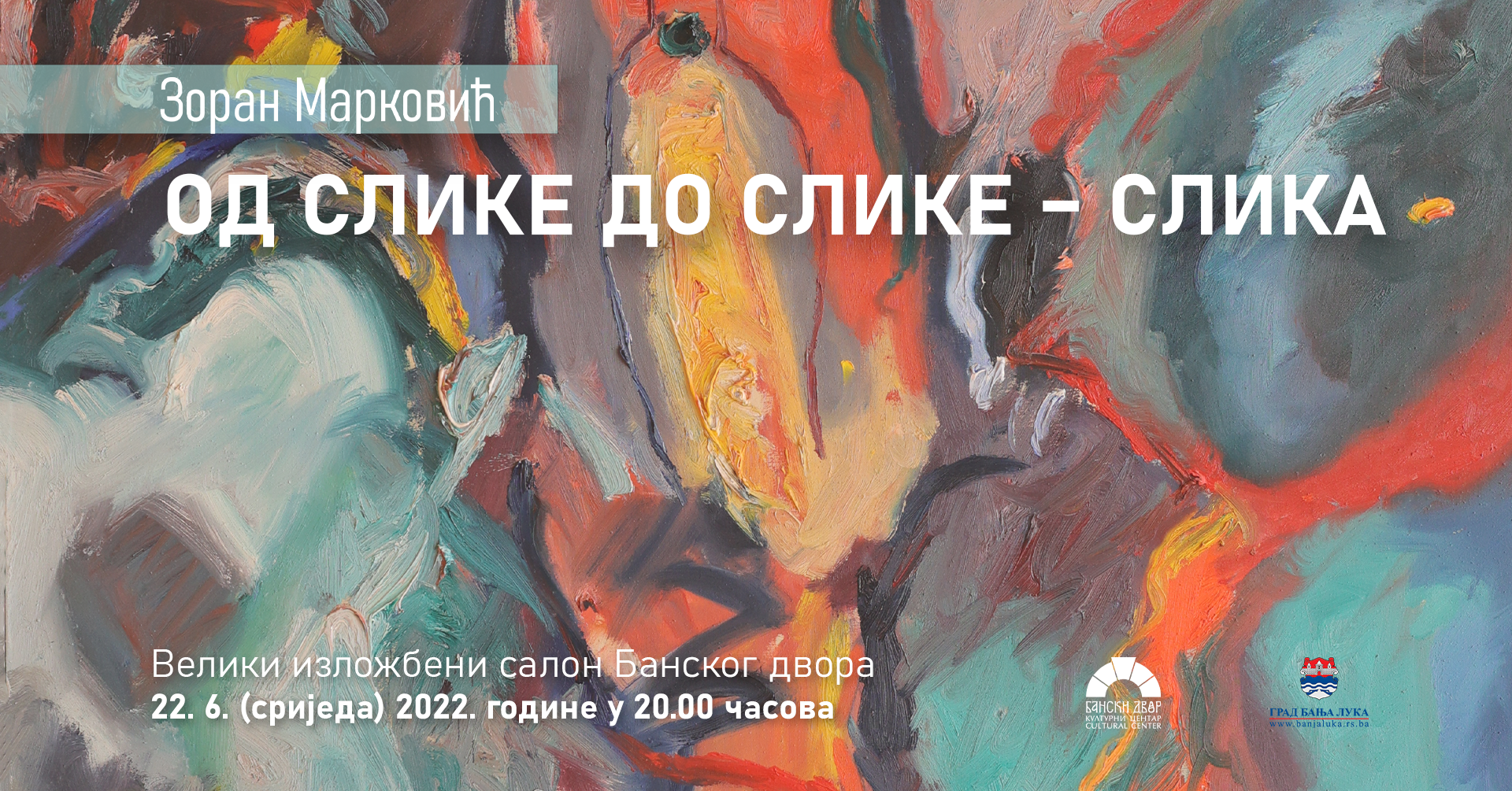 U Velikom izložbenom salonu Banskog dvora u srijedu, 22. juna u 20.00 časova biće otvorena izložba „Od slike do slike – slika“ autora Zorana Markovića.