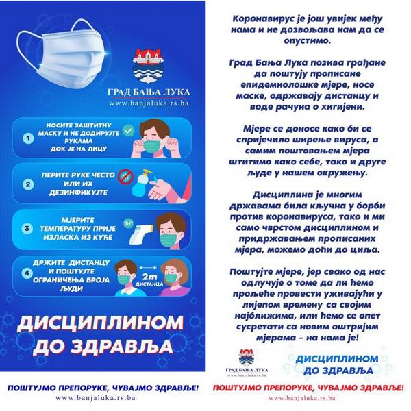 Због неповољне епидемиолошке ситуације, Град Бања Лука у наставку кампање под називом „Дисциплином до здравља“, позива суграђане на придржавање прописаних епидемиолошких мјера.