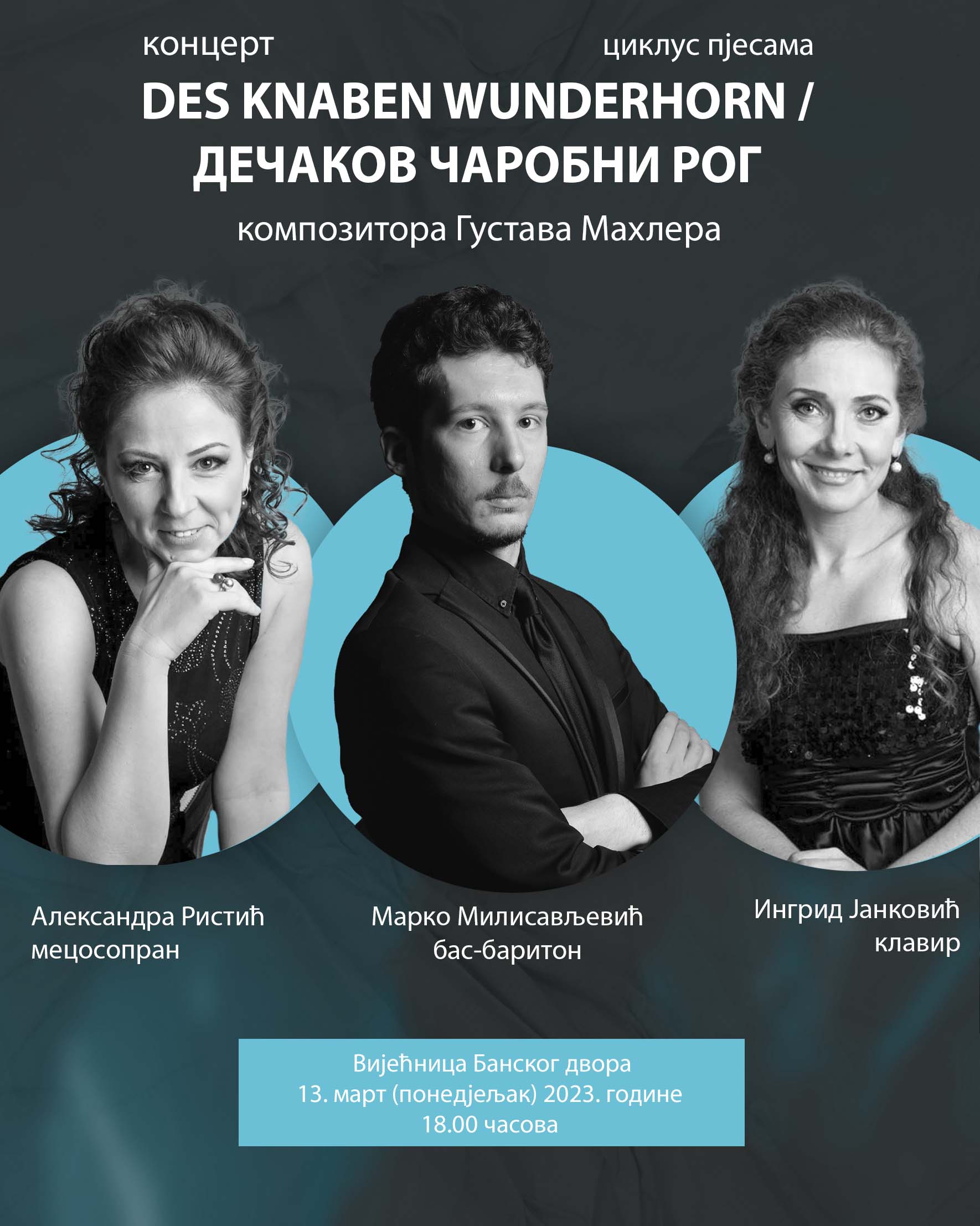 У Вијећници Банског двора 3. марта у 18.00 часова биће одржан концерт Циклус пjесама DES KNABEN WUNDERHORN/ДЕЧАКОВ ЧАРОБНИ РОГ композитора Густава Махлера, који ће извести Александра Ристић, мецосопран, Марко Милисављевић, бас-баритон и Ингрид Јанковић, клавир.