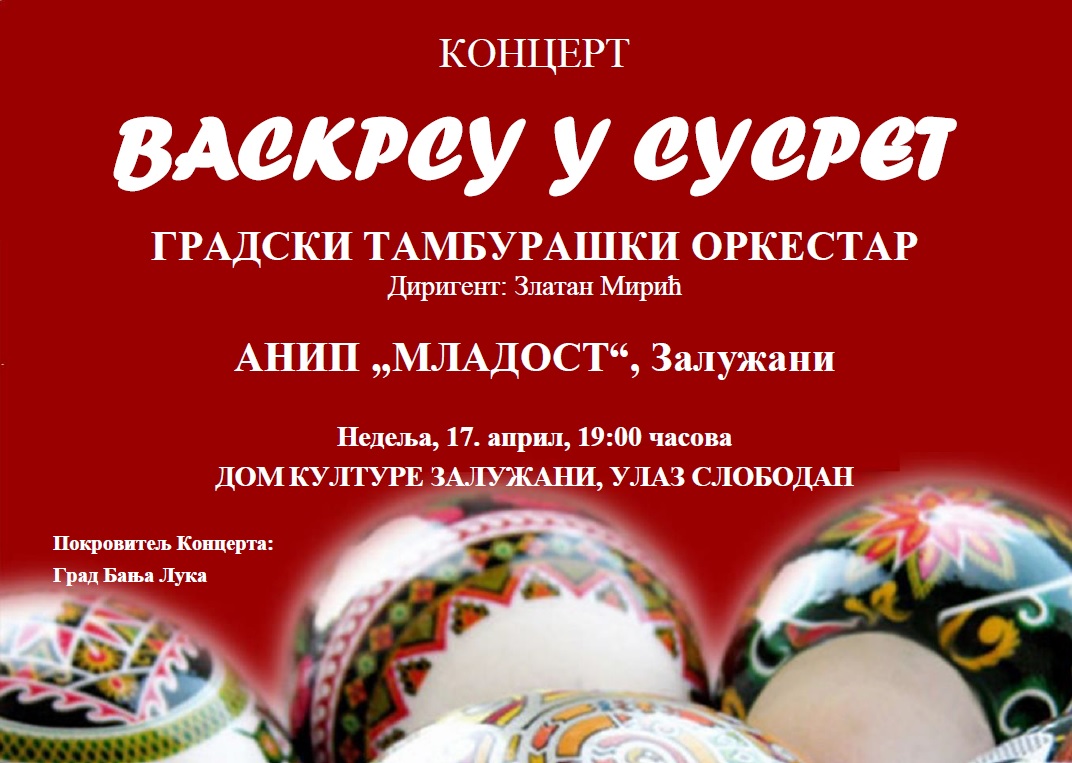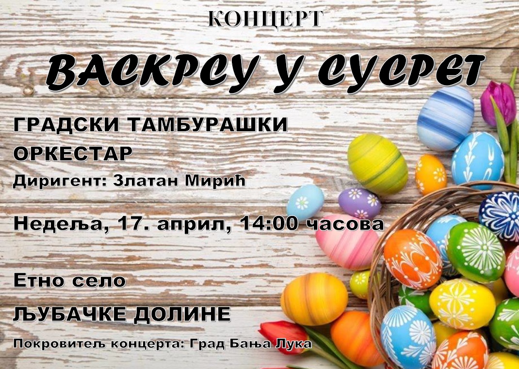 Градски тамбурашки оркестар ће на празник Цвијети, у недјељу, 17. априла  са почетком у 14.00 часова , у Етно селу „Љубачке долине“ одржати концерт под називом „Васкрсу у сусрет“.