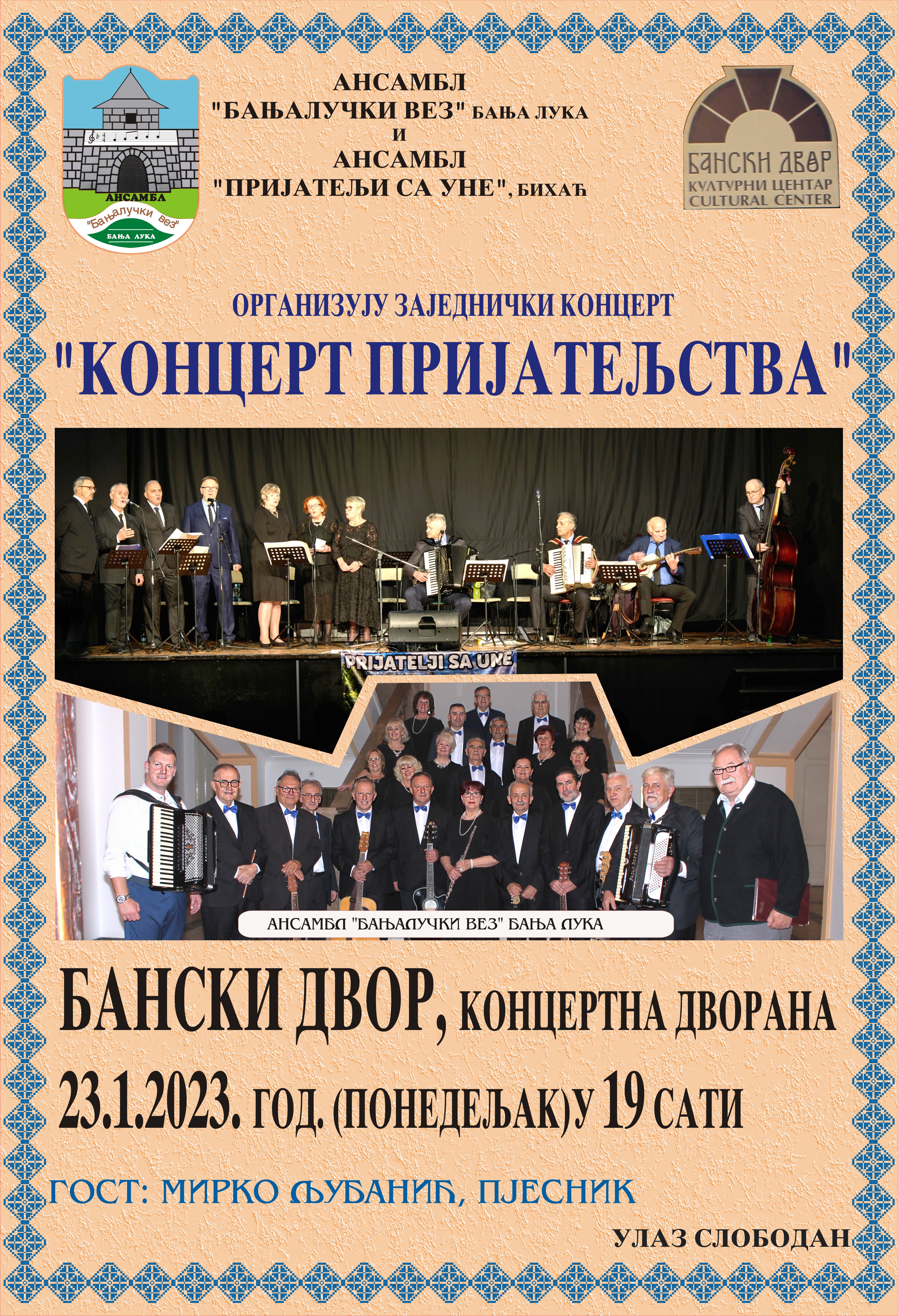 Zajednički koncert Ansambla „Banjalučki vez“ i Ansambla „Prijatelji sa Une“ iz Bihaća biće održan u ponedjeljak 23. januara u Koncertnoj dvorani Banskog dvora.