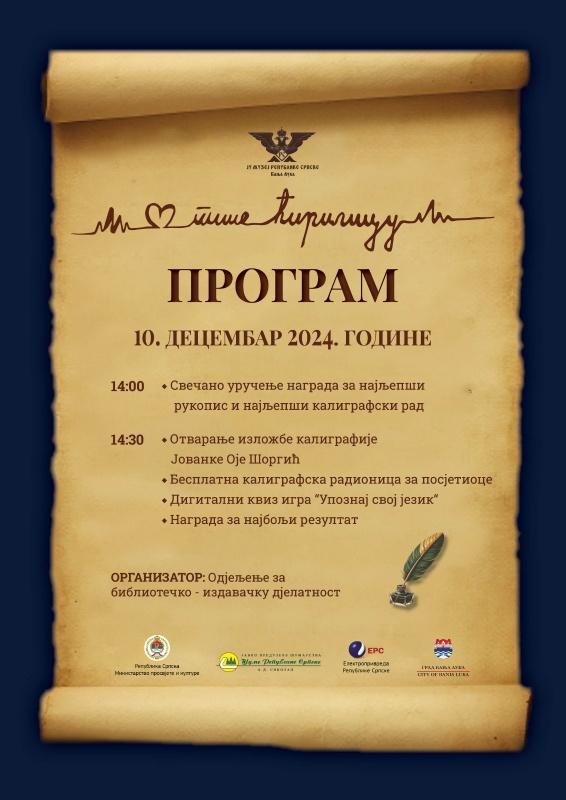 Отварање манифестације „Музејски дани ћирилице – Срце пише ћирилицу“, најављено је за 10. децембра у 14 часова, у Музеју Републике Српске, када ће бити уручене и награде за најљепши ћирилични рукопис и калиграфски рад. Улаз је слободан.