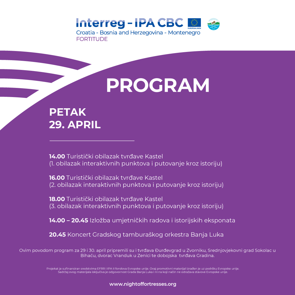 Сви заинтересовани имају прилику да 29. априла на један интерактиван начин обиђу тврђаву Кастел, гдје ће у пратњи туристичког водича слушати приче о историји, култури, али и бројним, мање познатим, занимљивостима. Причу ће пратити експонати, умјетници, те радови креативних Бањалучана.