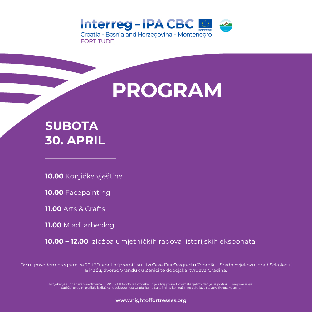 Све посјетиоце, у петак и суботу очекује интерактивно путовање кроз историју, радионице за дјецу, као и концерт Градског тамбурашког оркестра.