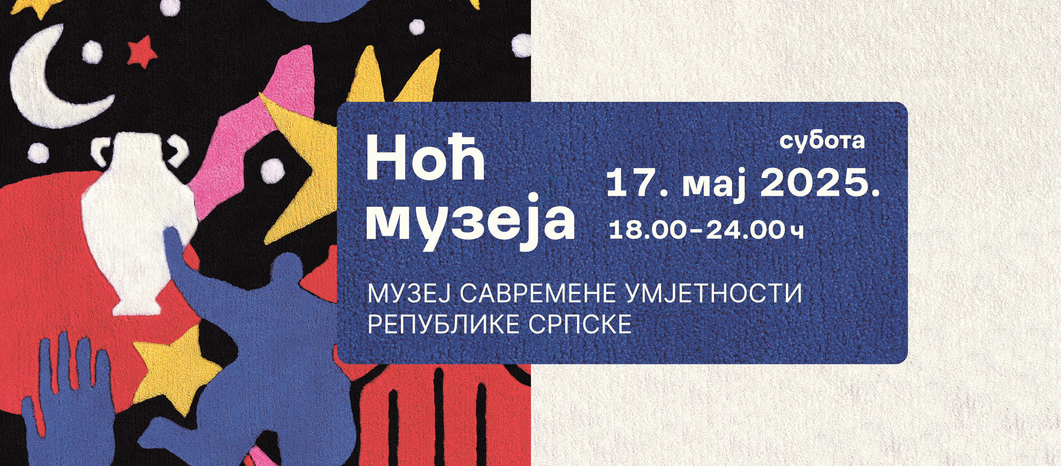 У суботу, 17. маја од 18.00 до 24.00 часа Музеј савремене умјетности Републике Српске обиљежава европску Ноћ музеја 2025 чија овогодишња тема „Будућност музеја у заједницама које се брзо мијењају” наглашава кључну улогу музејских институција у пружању савременог едукативног искуства. Овогодишња тема нас позива да преиспитамо улогу музеја у комплексним друштвеним кретањима, његову улогу у очувању културне баштине и његов потенцијал да кроз покретање важних друштвених питања усмјерава умјетничке токове.
