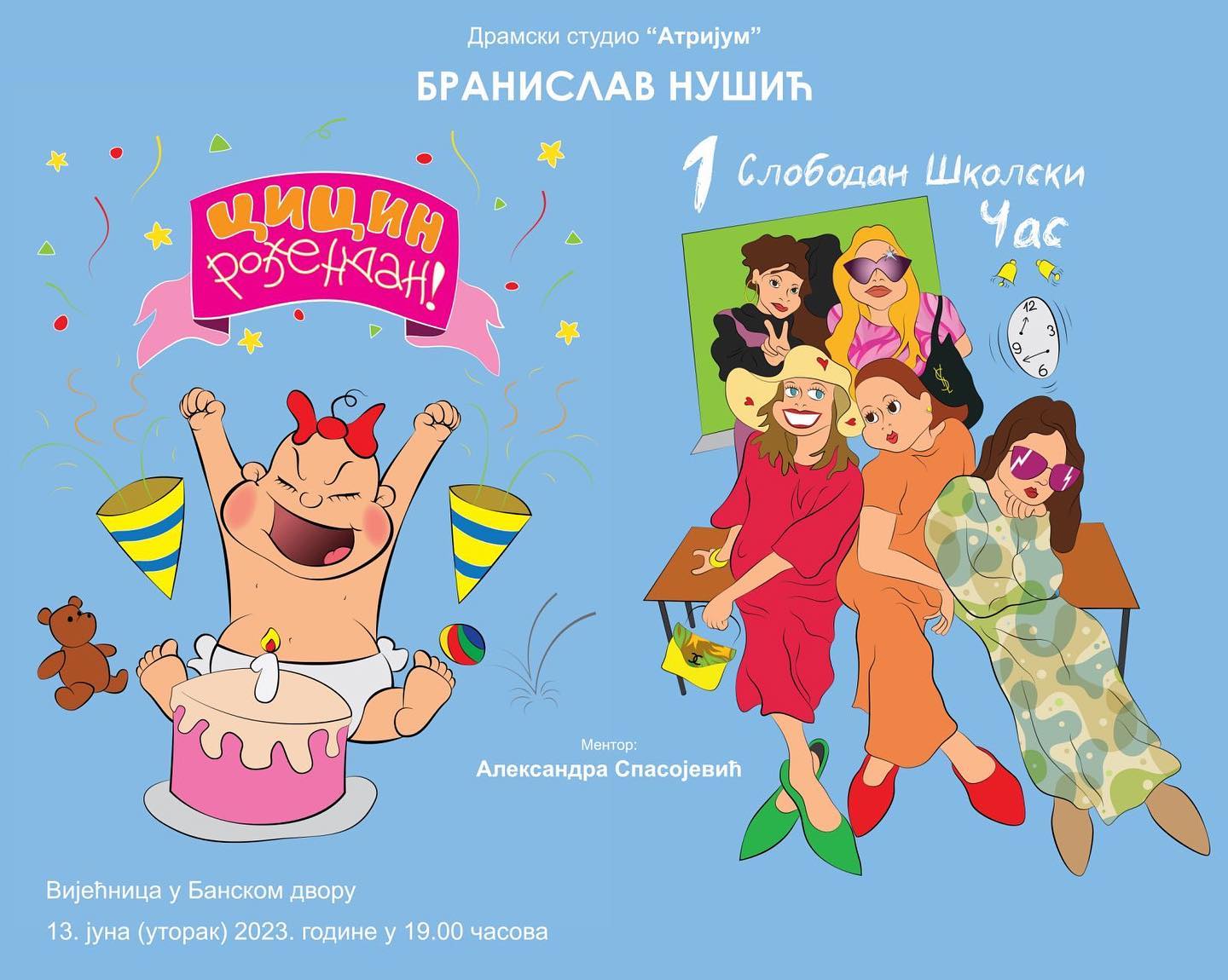 Тога дана од 19.00 часова сви посјетиоци моћи ће уживати у једночинкама “Цицин рођендан” и “Један слободан школски час” из збирке “Театар за децу”, коју је Нушић посветио најмлађој публици.