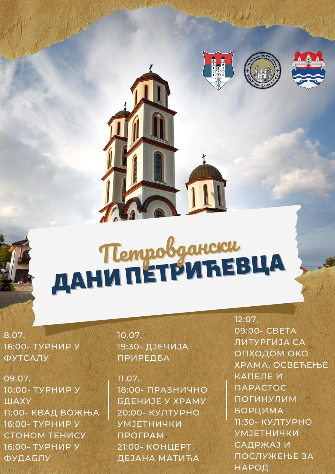 -Već tradicionalno pozivamo sve sugrađane da budu dio ove manifestacije. Uz sport, druženje i pjesmu obilježićemo i ove godine manifestaciju „Petrovdanski dani Petrićevca“. Vidimo se kod crkve Svetog Petra i Pavla“ i na igralištu Osnovne škole „Miloš Crnjanski“ – poručuju organizatori.