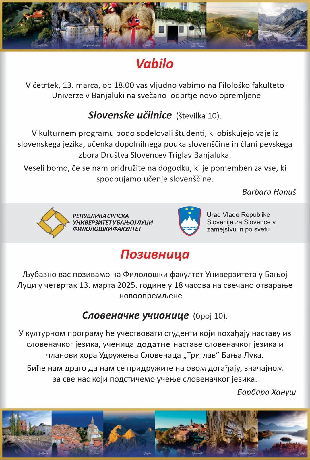Удружење Словенаца „Триглав“ Бања Лука најавило је да ће 13. марта бити отворена новоопремљена Словеначка учионица на Филолошком факултету Универзитета у Бањој Луци.
