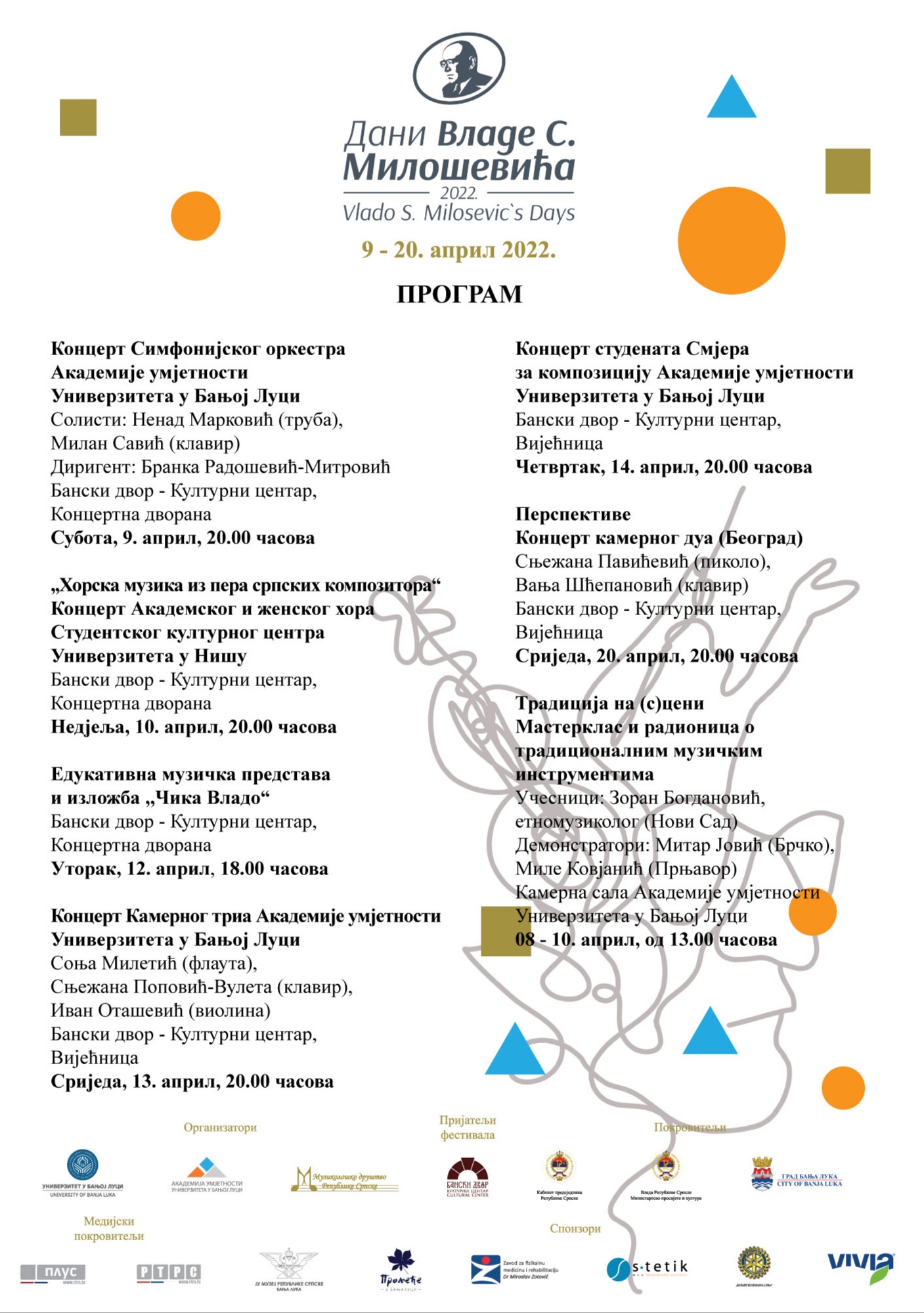 У част годишњице рођења академика Владе С. Милошевића, етномузиколога, композитора и музичког педагога, једног од највећих имена умјетничке музике Републике Српске и БиХ и ове године биће приређен богат културно – умјетнички програм, који ће трајати до 20. априла.