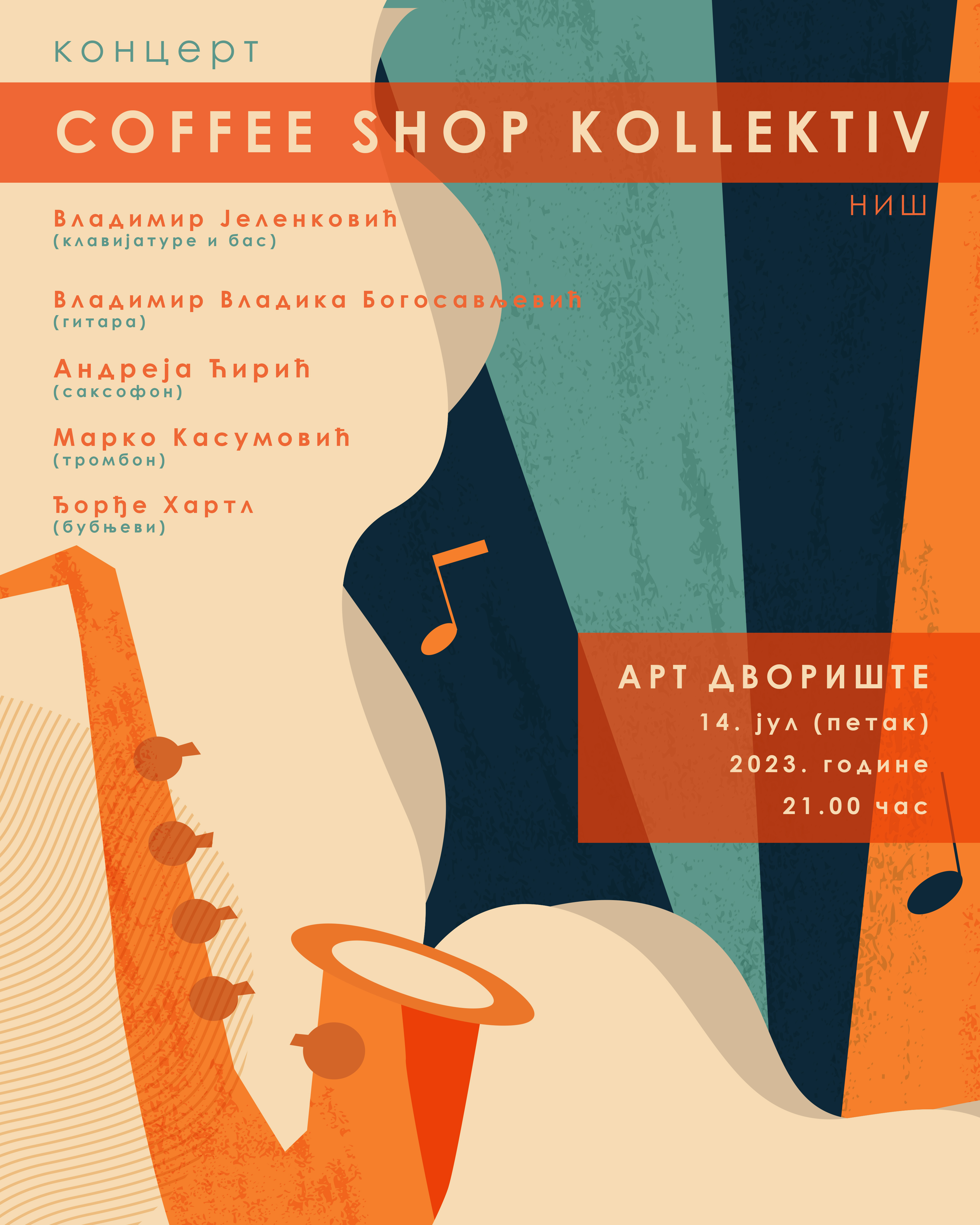 –„Coffee Shop колектива“ је прави репрезент другог највећег града у Србији, који се често спомиње као фанк престоница. Овај састав чине Владимир Јеленковић (клавијатуре и бас) Владимир Владика Богосављевић (гитара) Андреја Ћирић (саксофон) Марко Касумовић (тромбон) и Ђорђе Хартл (бубњеви) – наведено је у саопштењу.