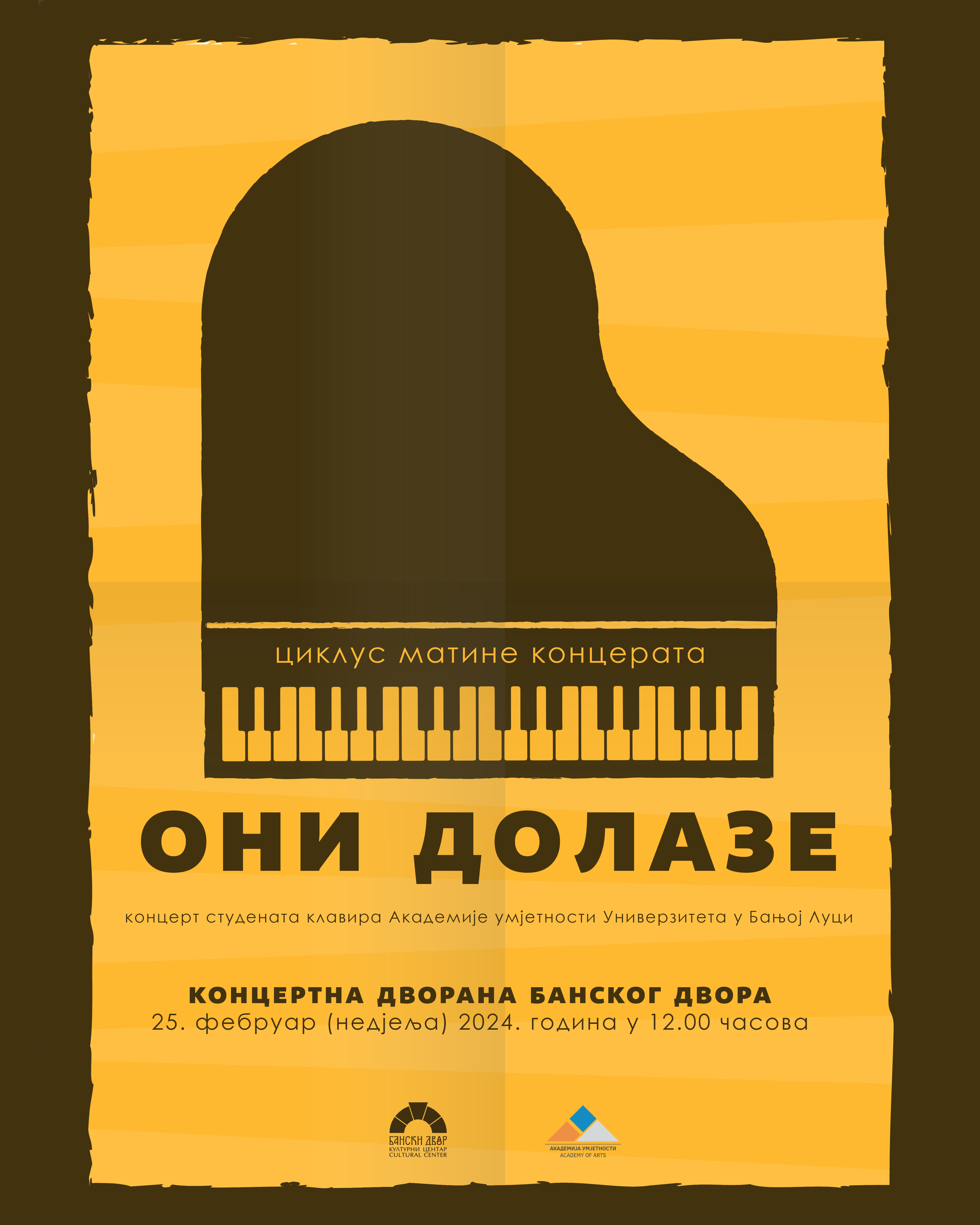 У Концертној дворани Банског двора 25. фебруара у 12.00 часова биће одржан концерт студената клавира Академије умјетности Универзитета у Бањој Луци. Улаз је слободан.