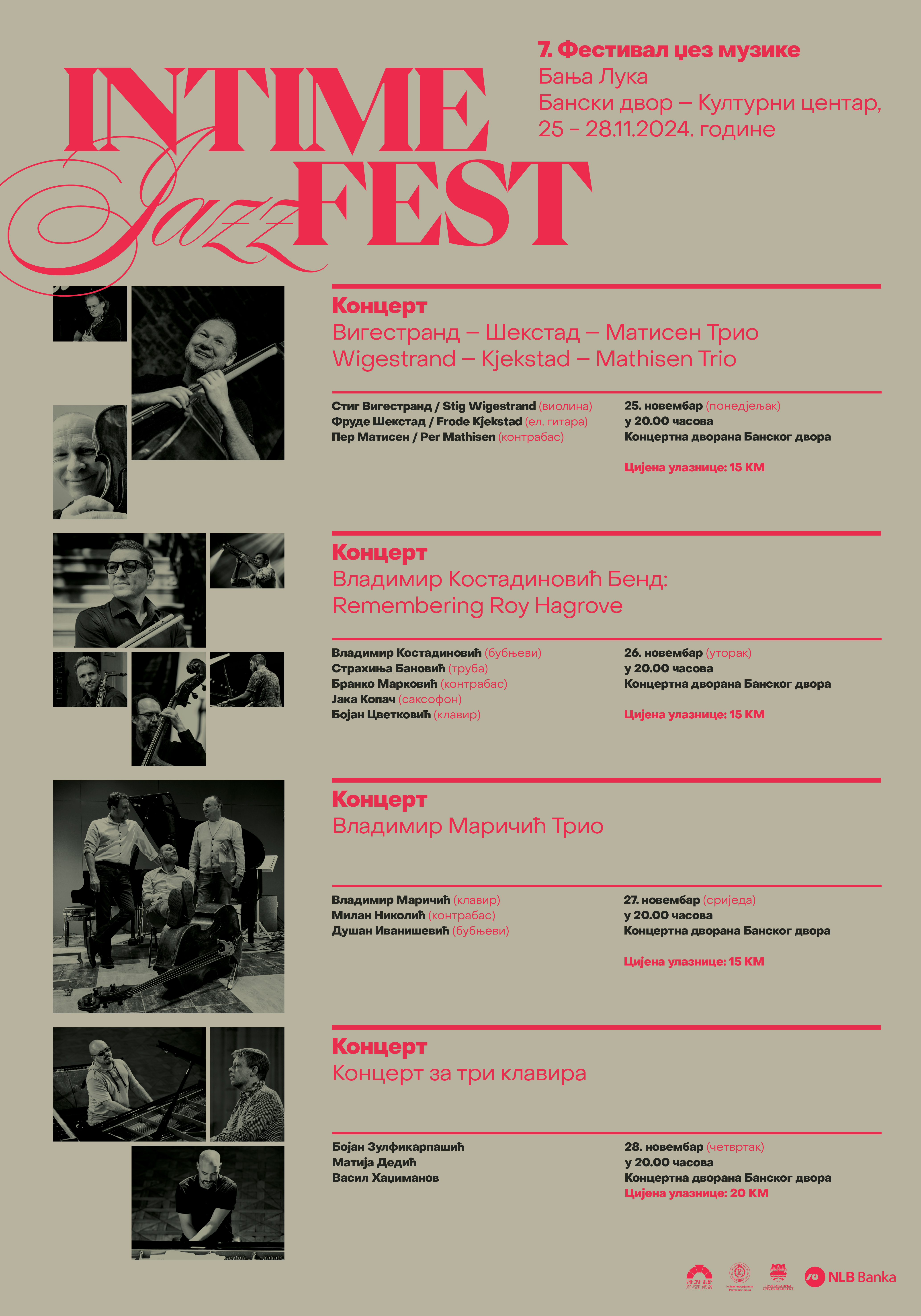Седми фестивал џез музике INTIME JAZZ FEST почиње вечерас, 25. новембра у 20.00 у Концертној дворани Банског двора наступом врхунског џез трија из Норвешке којег чине СТИГ ВИГЕСТРАНД/ STIG WIGESTRAND  (виолина) –  ФРУДЕ ШЕКСТАД / FRODE KJEKSTAD (ел. гитара) – ПЕР МАТИСЕН / PER MATHISEN (контрабас).