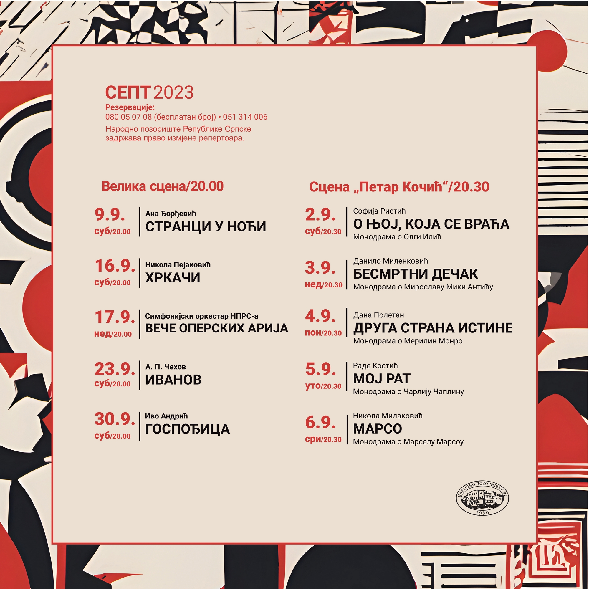 Осим што ће Народно позориште Републике Српске нову сезону отворити серијом монодрама које ће бити одигране на „Петар Кочић“ у периоду од 2. до 6. септембра, богат репертоар вас од од суботе 9. септембра очекује и на Великој сцени.